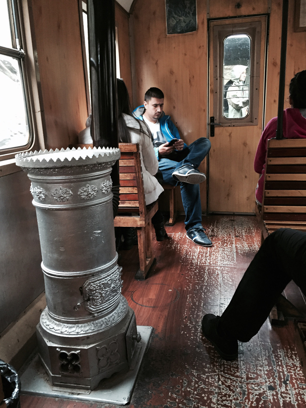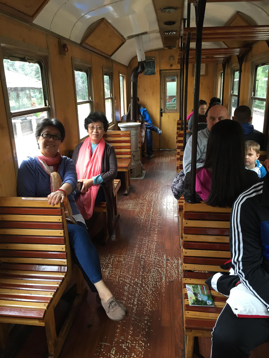 上车了,小火车的铁轨是窄轨,只有不到1米宽,带有四个车厢,车厢过于老式还各不相同,有木椅硬座还有包厢,有个车厢里居然还有一个烧煤取暖的炉子,车厢内可以随便走动,就连车厢的门在行进中都可随意打开,