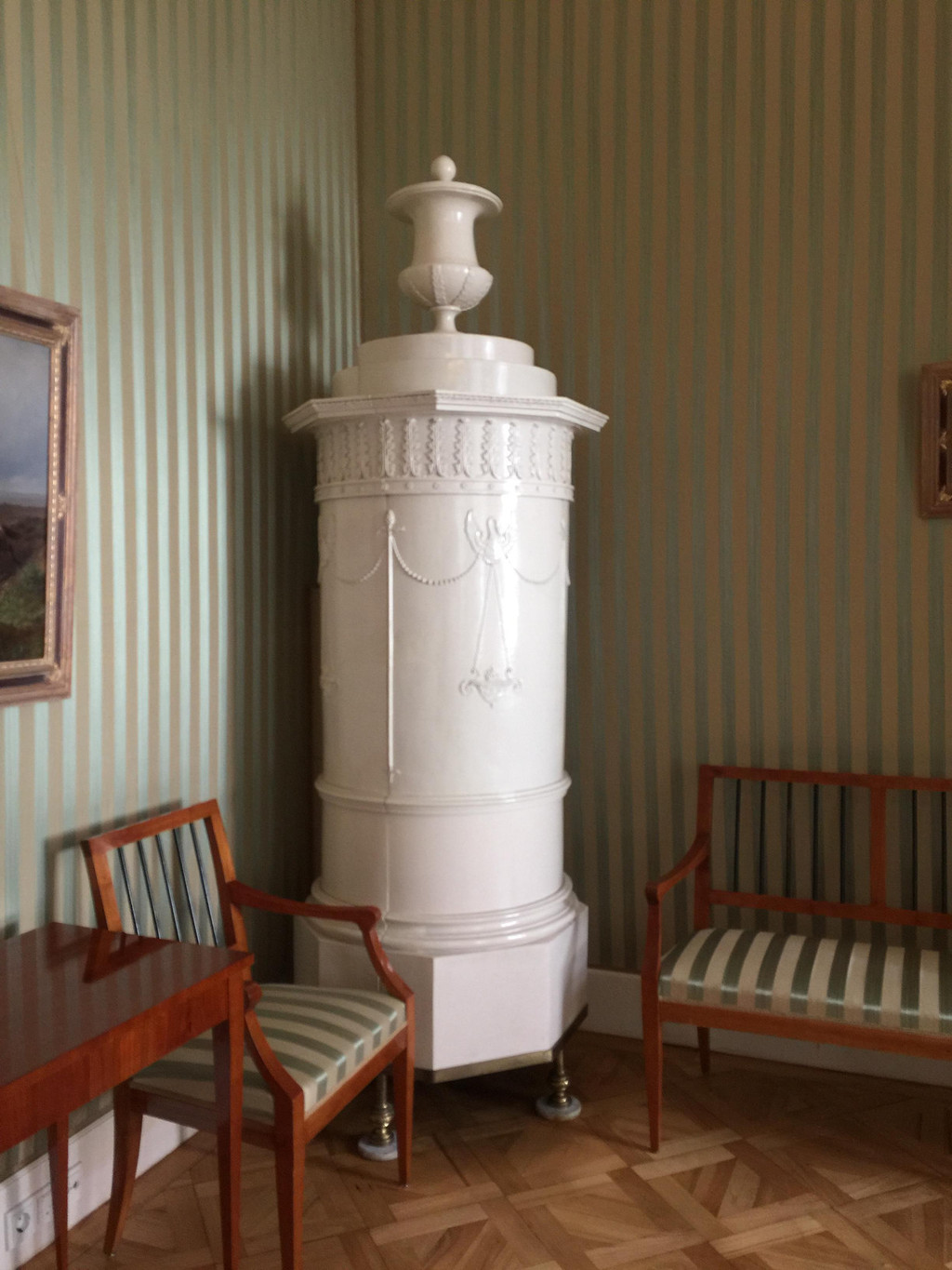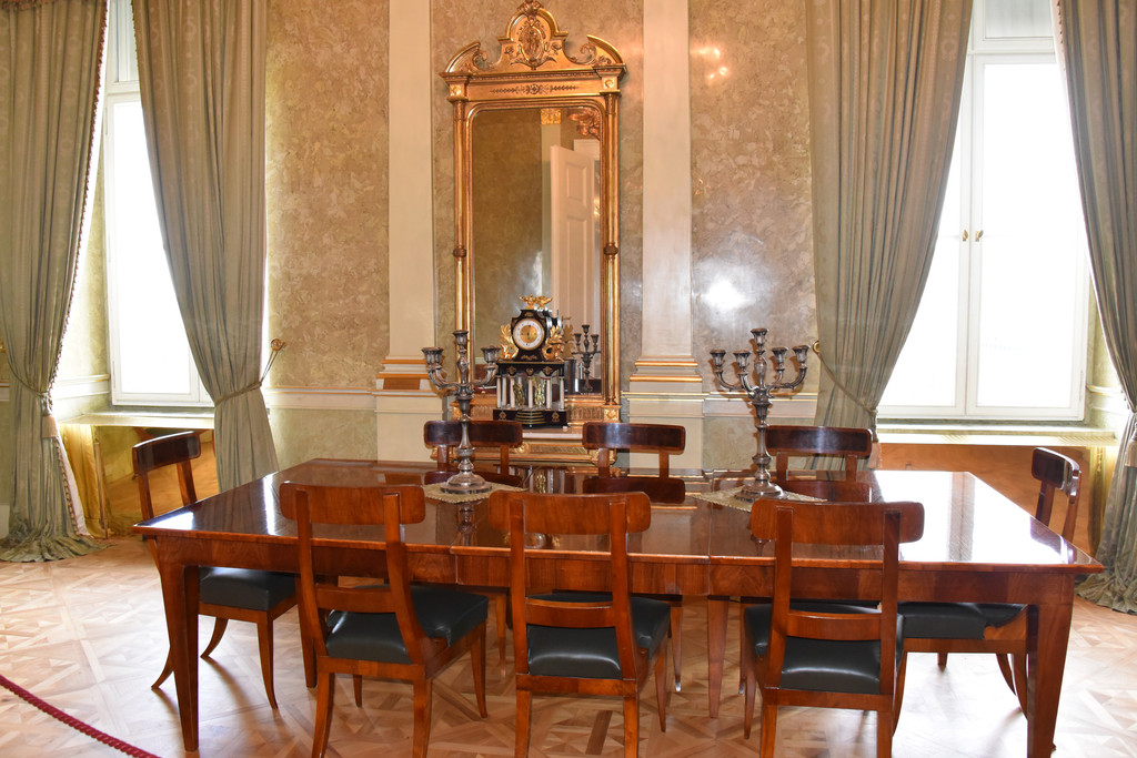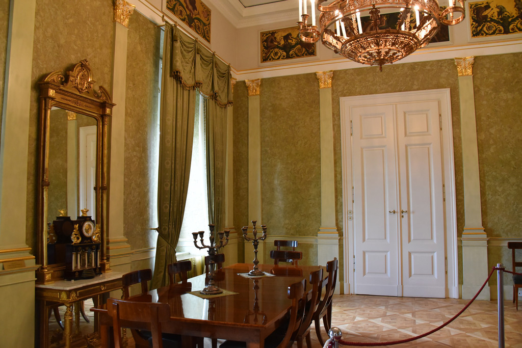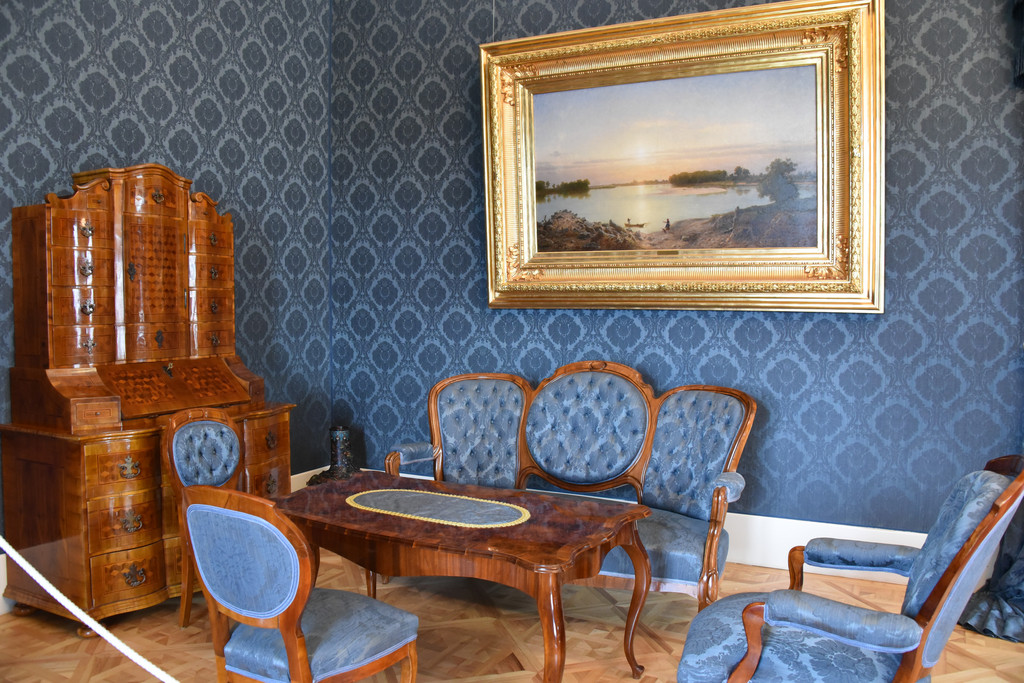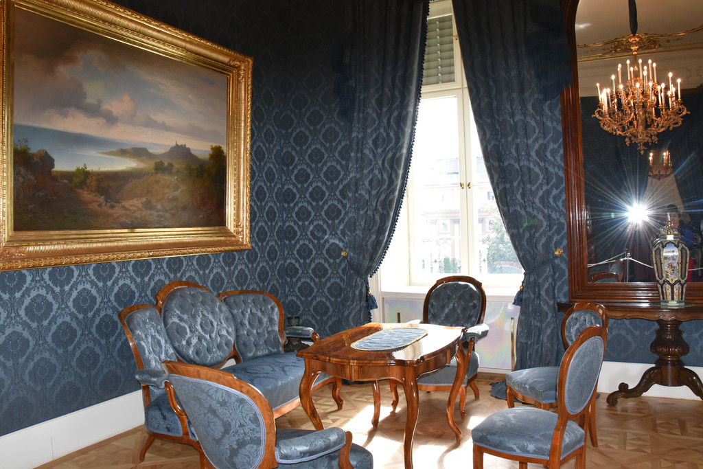蓝色房间,这里的壁纸、窗帘、沙发的颜色全部统一成蓝色,墙上挂着风景油画,从吊灯的样子以及房顶上的描金装饰可以看出这间房屋的重要性,