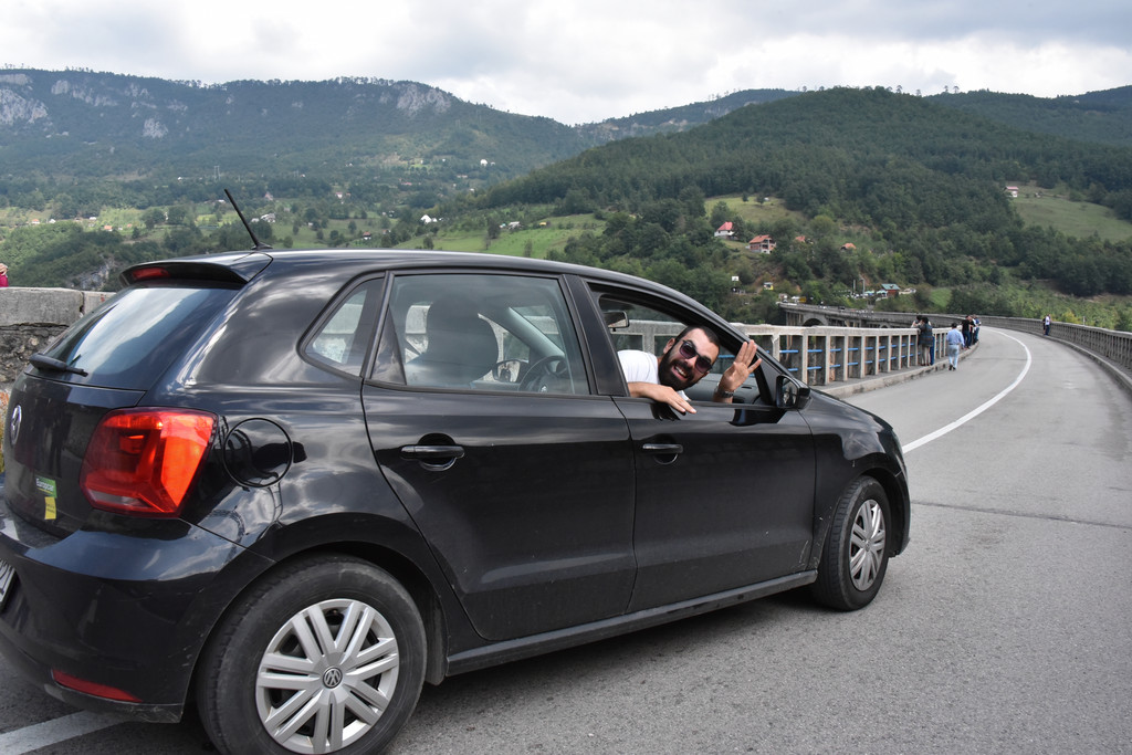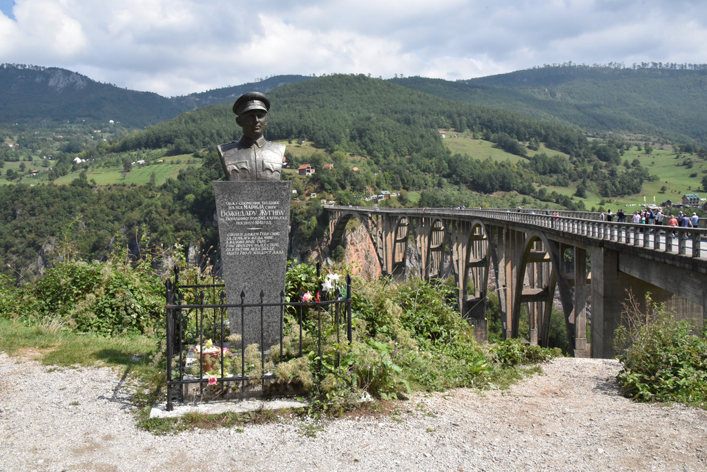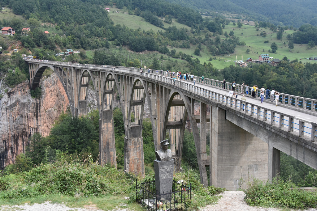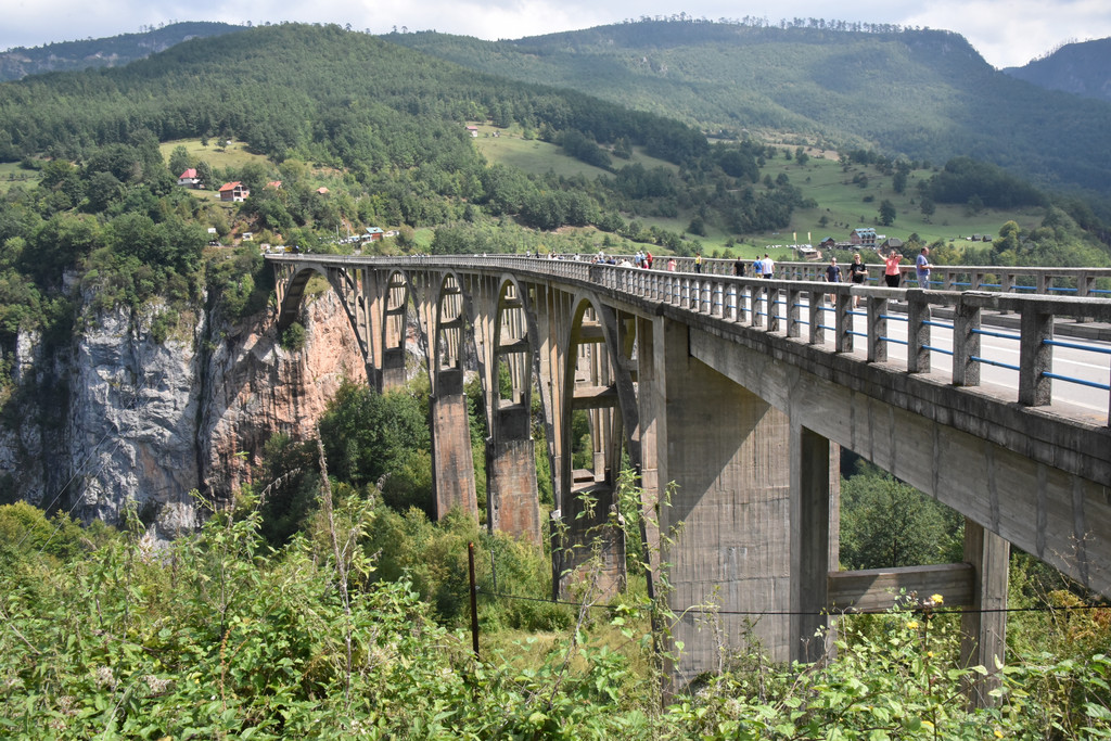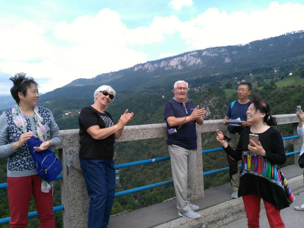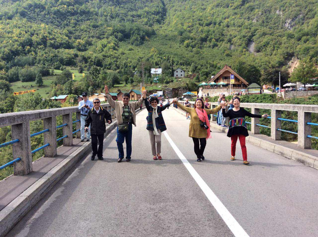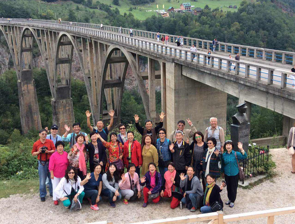 为今天更好地了解要游览的景点,郑导昨天特意在路上放映了前南斯拉夫的电影《桥》,电影是77年由上海电影制片厂译制的,是改革开放后率先进入中国的几部外国电影之一,那个时期过来的我们几乎对电影每个场景和对白都了如指掌,电影中的主题歌啊朋友再见几乎没有人不会唱,成了那个时代的印记。故事描写的是1942年二战期间,希腊的德军欲经南斯拉夫撤退回德国,南斯拉夫游击队接到情报,派出由“老虎”领导的一个小分队在德军撤到附近时将桥炸掉,否则将有5000多人牺牲,老虎找到桥的设计者,识破敌人诡计,与德国盖世太保巧妙周旋,最终在规定的时间将桥炸掉,被拦截在桥另一侧的德军被歼灭。这是一个真实的故事,故事就发生在黑山的塔拉河谷,那是一座横跨河谷的大桥,建造于1937-1941年,桥长365米,距河面高度172米,5个桥拱,1942年被炸,1946年被修复。塔拉河谷大桥到了,见到桥的那一刻大家不约而同地用电影中的一句话赞美一声“真是一座好桥!”