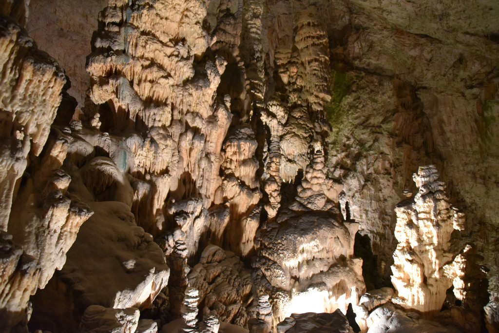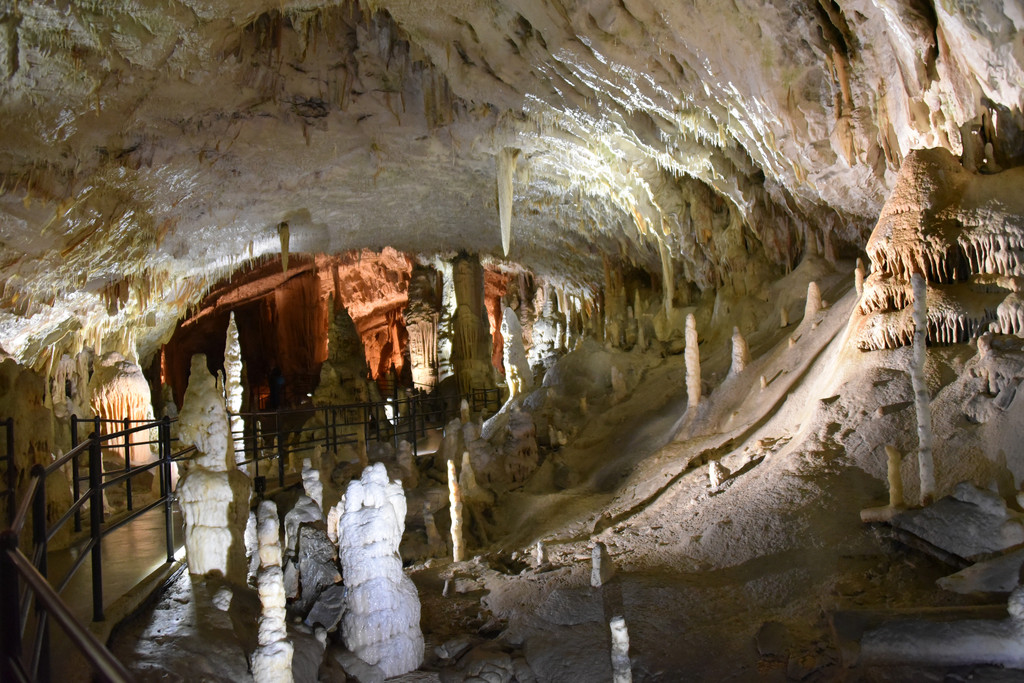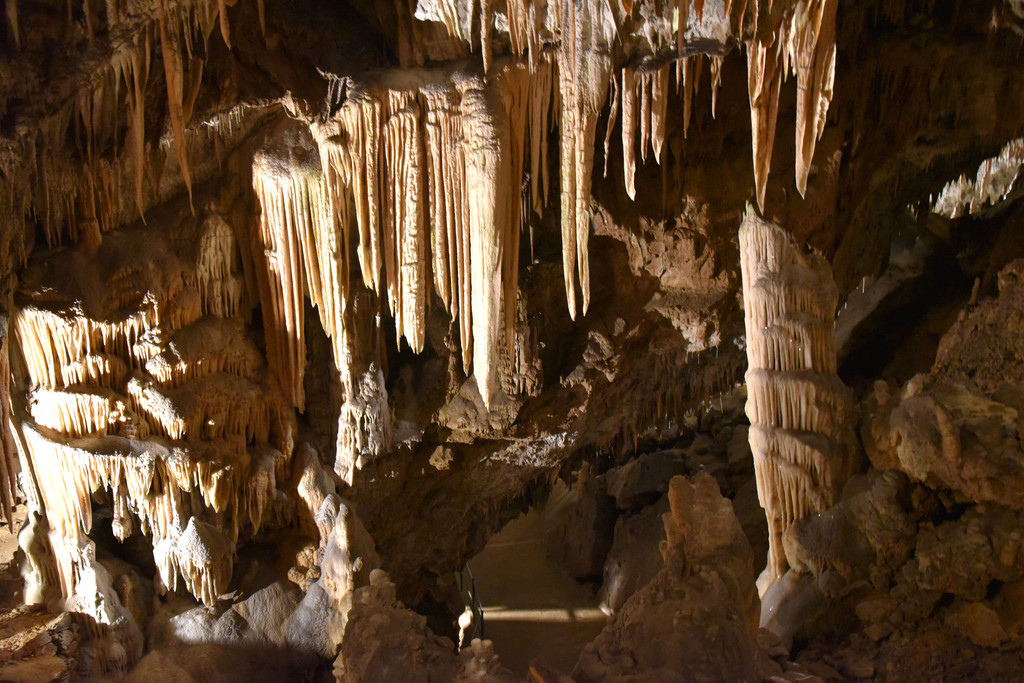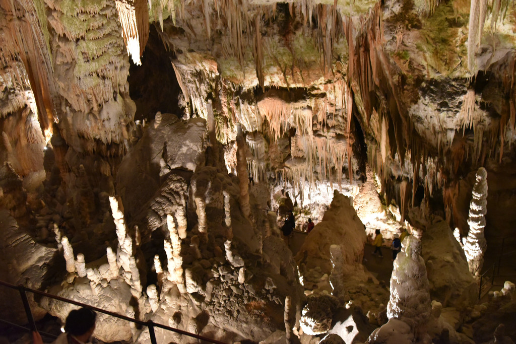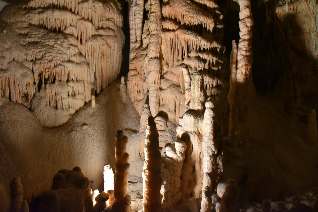 向前走,进入另一个厅,这里开始出现一些粗大的钟乳石,顶天立地,顶上垂下的石幔也开始变厚,变长,像帷幔,像伞盖,甚至像章鱼的须子。