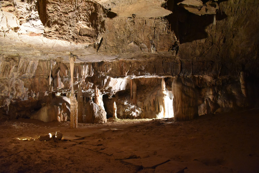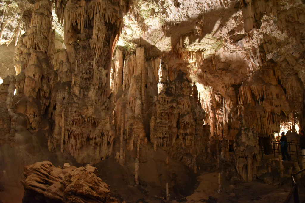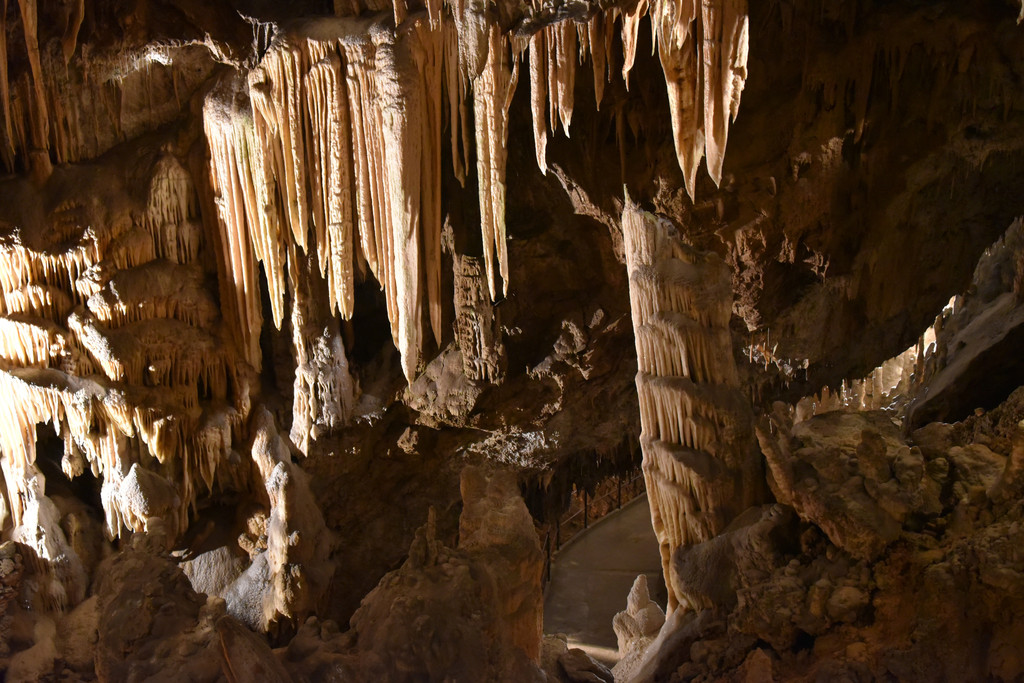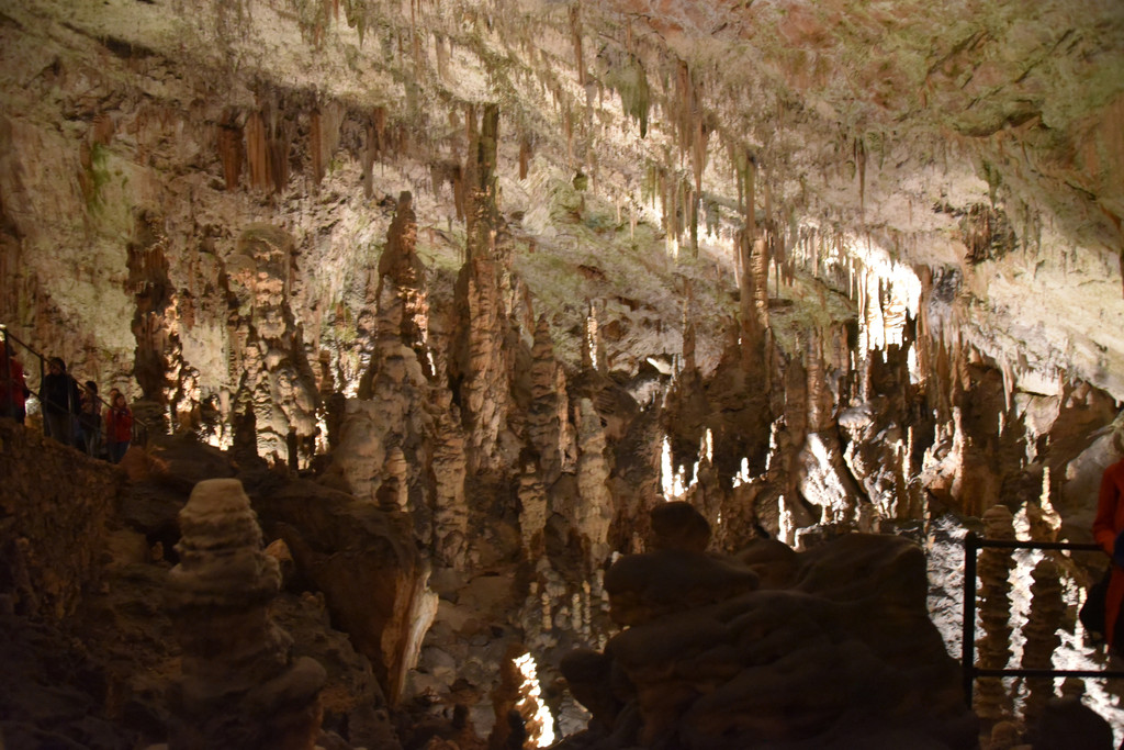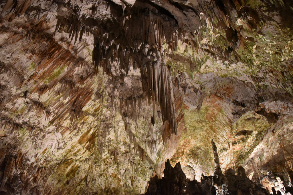 向前走,进入另一个厅,这里开始出现一些粗大的钟乳石,顶天立地,顶上垂下的石幔也开始变厚,变长,像帷幔,像伞盖,甚至像章鱼的须子。