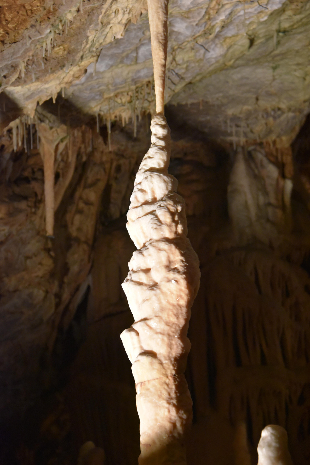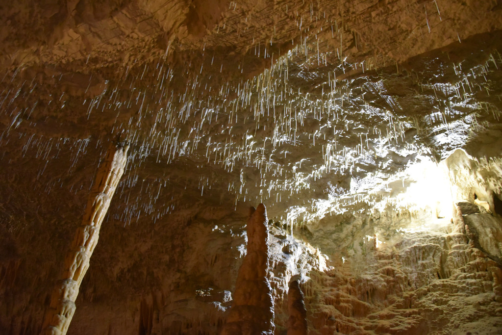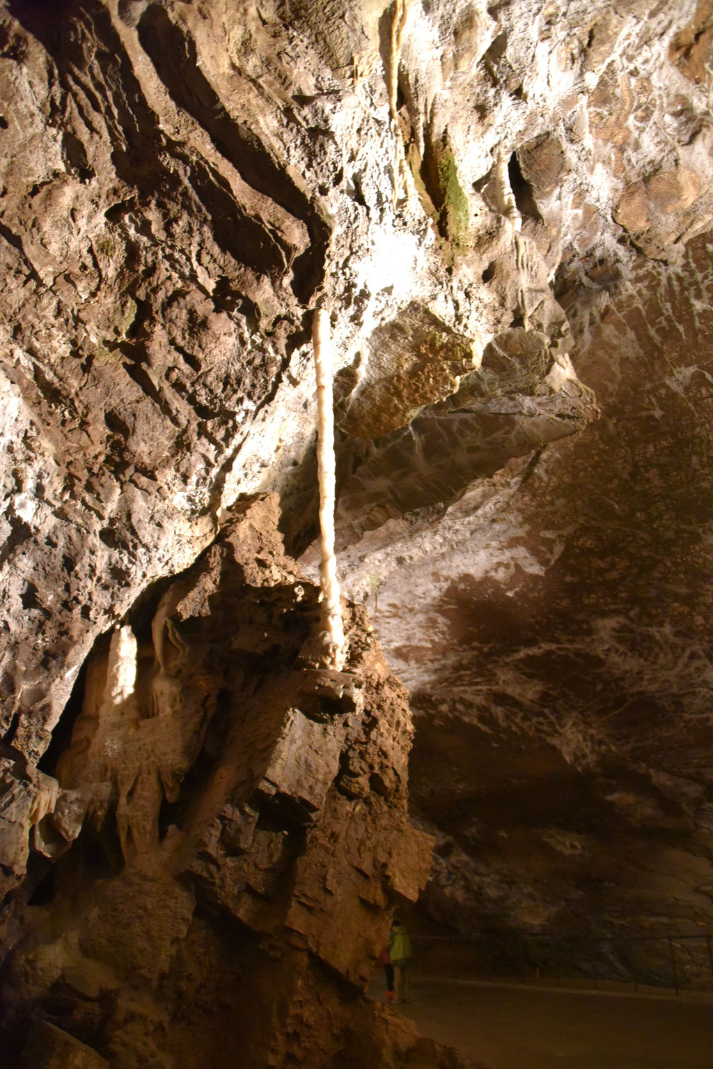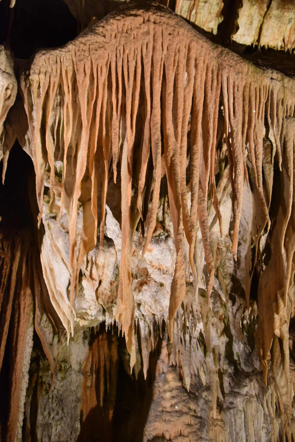 再向前顶上开始出现一些白色的下垂钟乳,细长,纯白色,在灯光下像一丝丝的挂面,这里是意大利面条厅(瞧瞧,这就是差异,我想到的是挂面,这里接近意大利当然一说面条就是意大利面啦),
