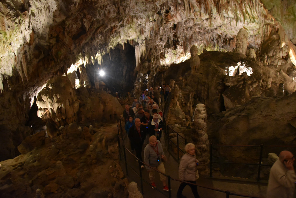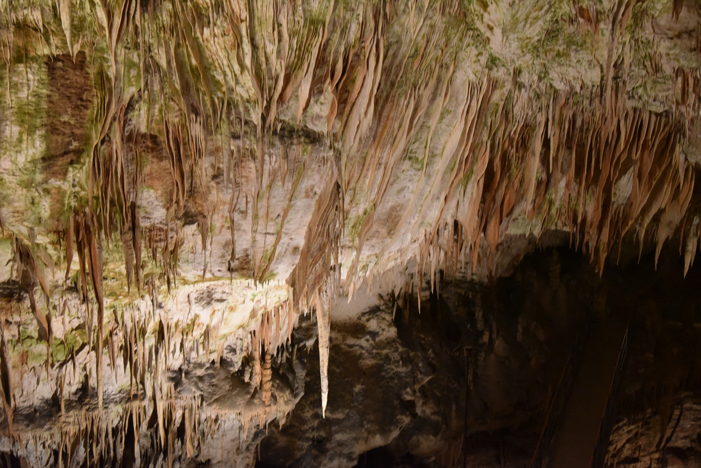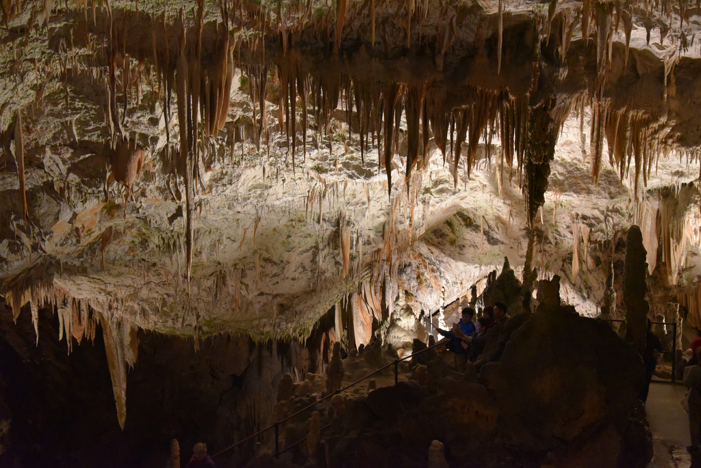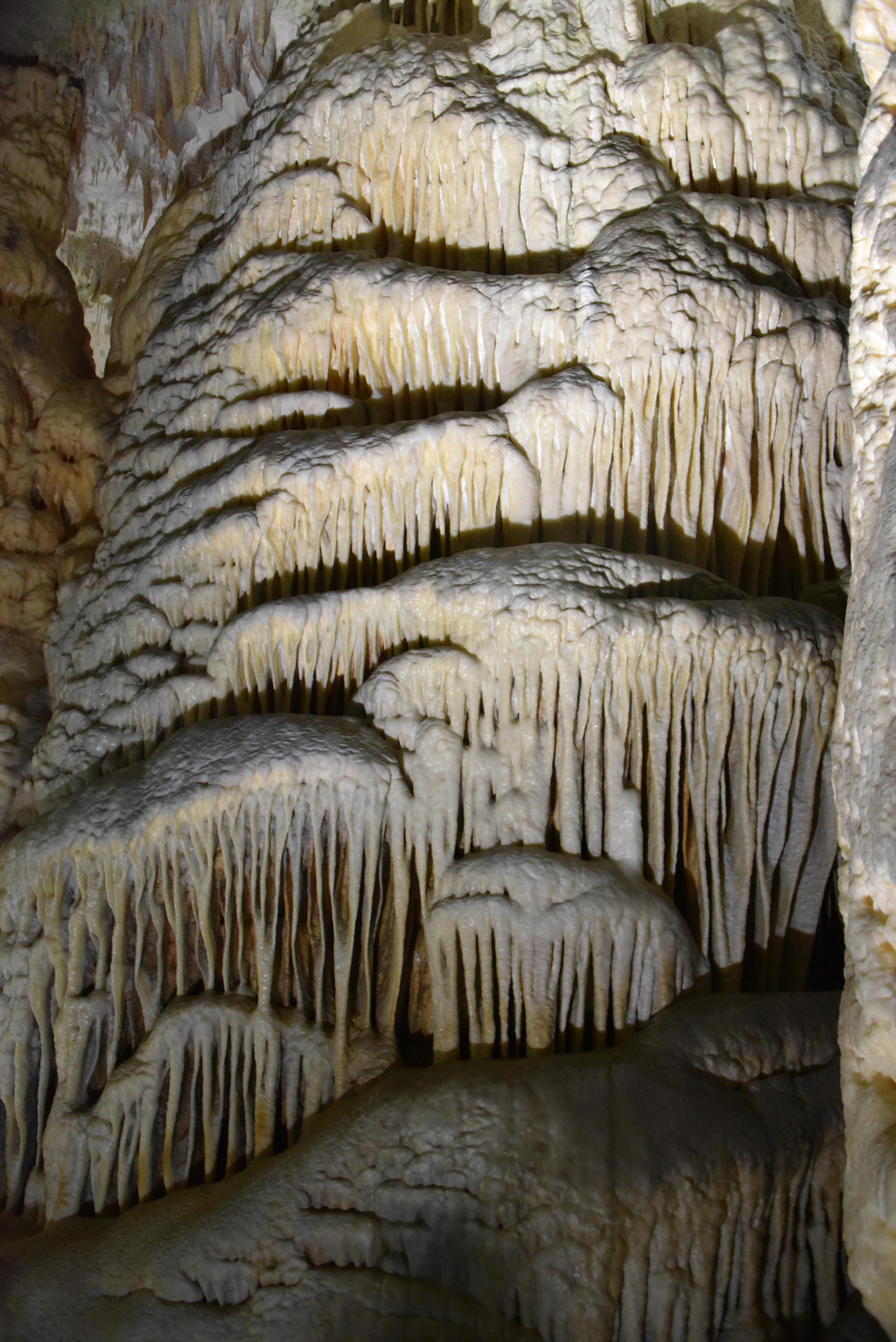 再向前顶上开始出现一些白色的下垂钟乳,细长,纯白色,在灯光下像一丝丝的挂面,这里是意大利面条厅(瞧瞧,这就是差异,我想到的是挂面,这里接近意大利当然一说面条就是意大利面啦),