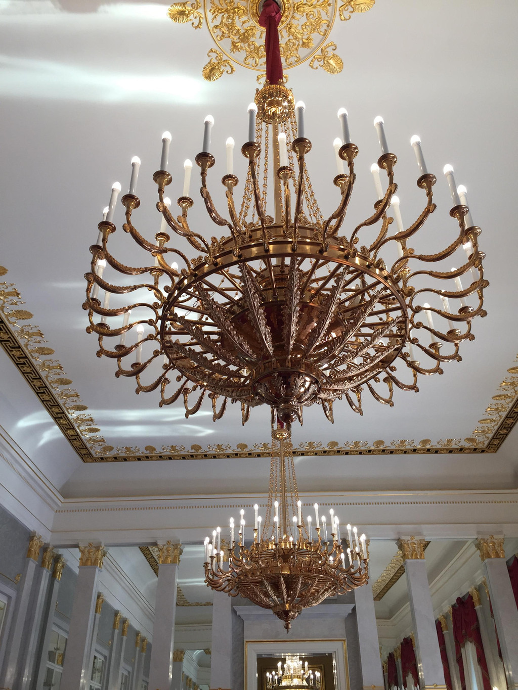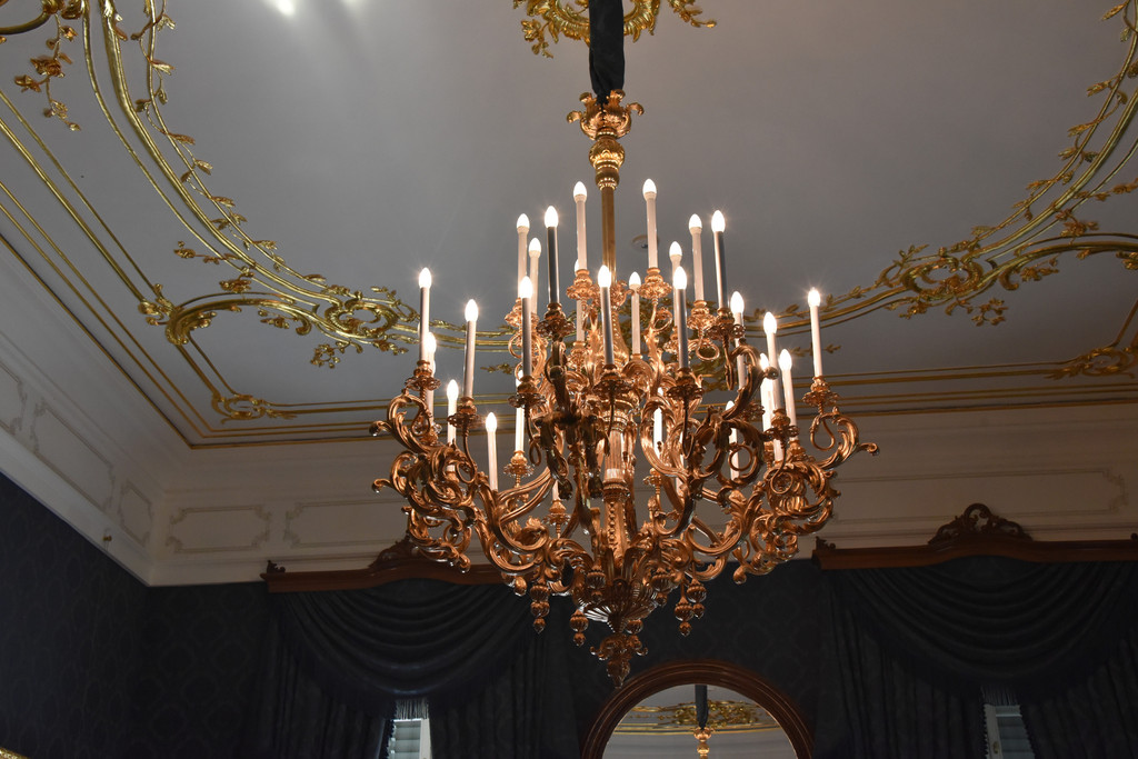 进入一个圆形房间,这里貌似另一个等候区,墙壁上出现壁画和雕塑,一个仿蜡烛的圆形吊灯型制简单,跟着红地毯的引导进入下一个房间,