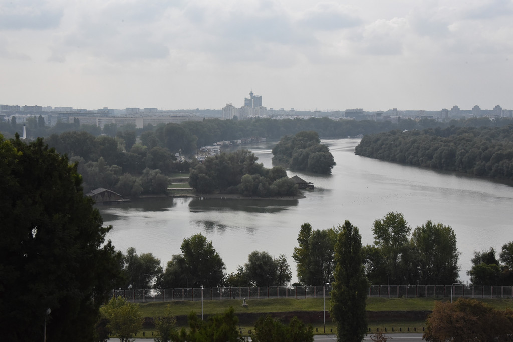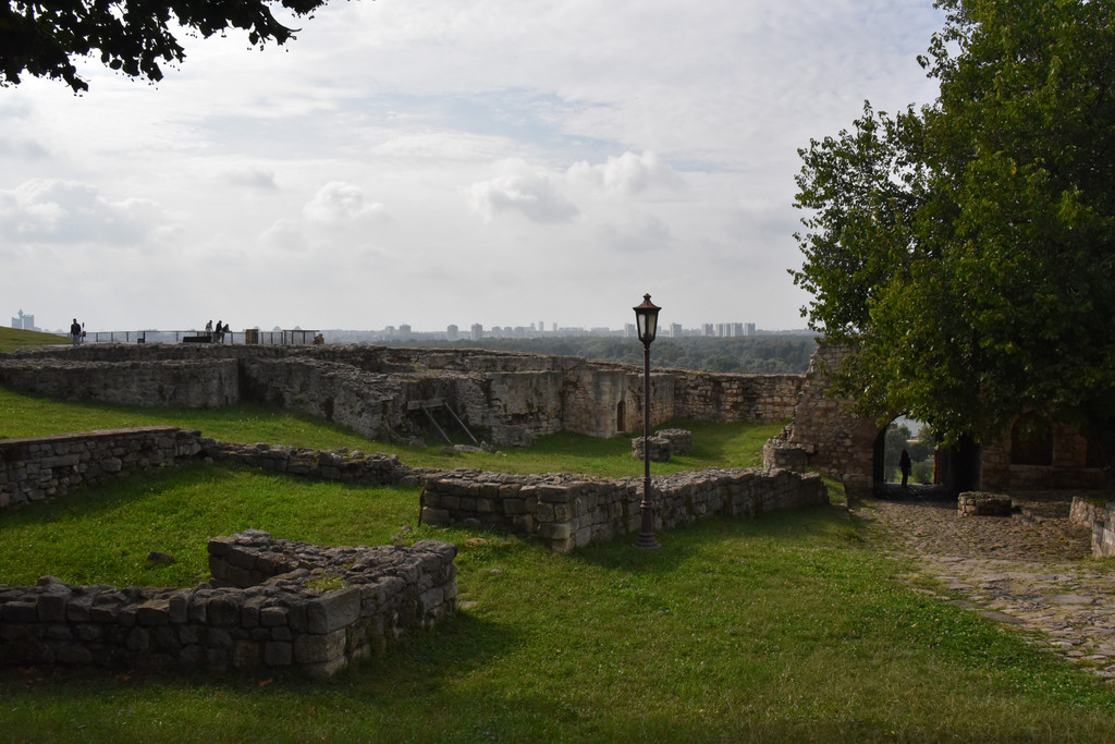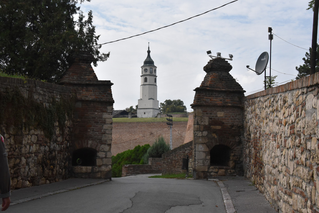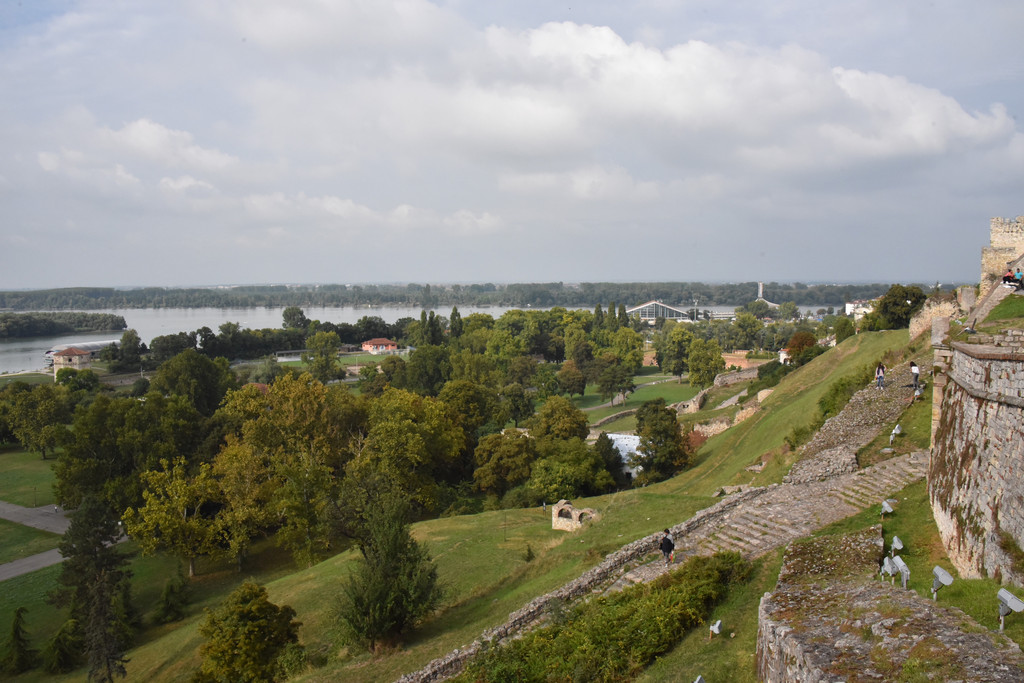 穿过尖塔下的拱形门洞就进入了城堡区,门洞的石头透着沧桑,这是山坡的顶部,从这里可以看到不远处两河交汇处,萨瓦河与多瑙河形成人字形分叉,左边的萨瓦河在此汇入多瑙河,
