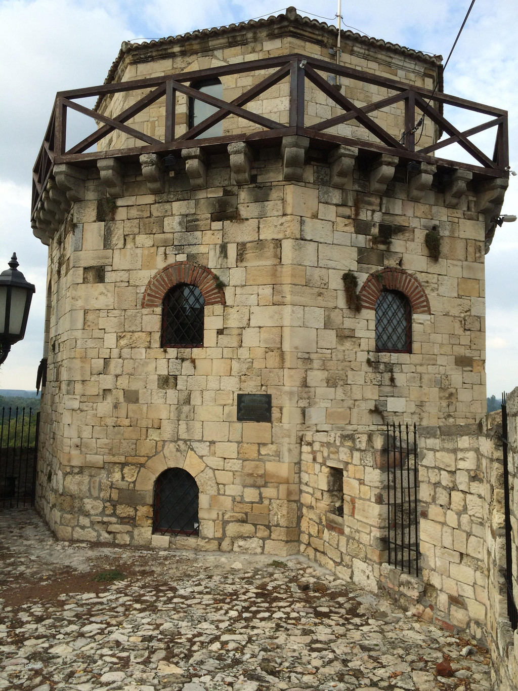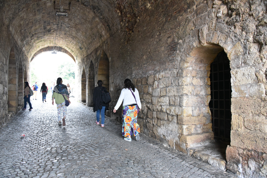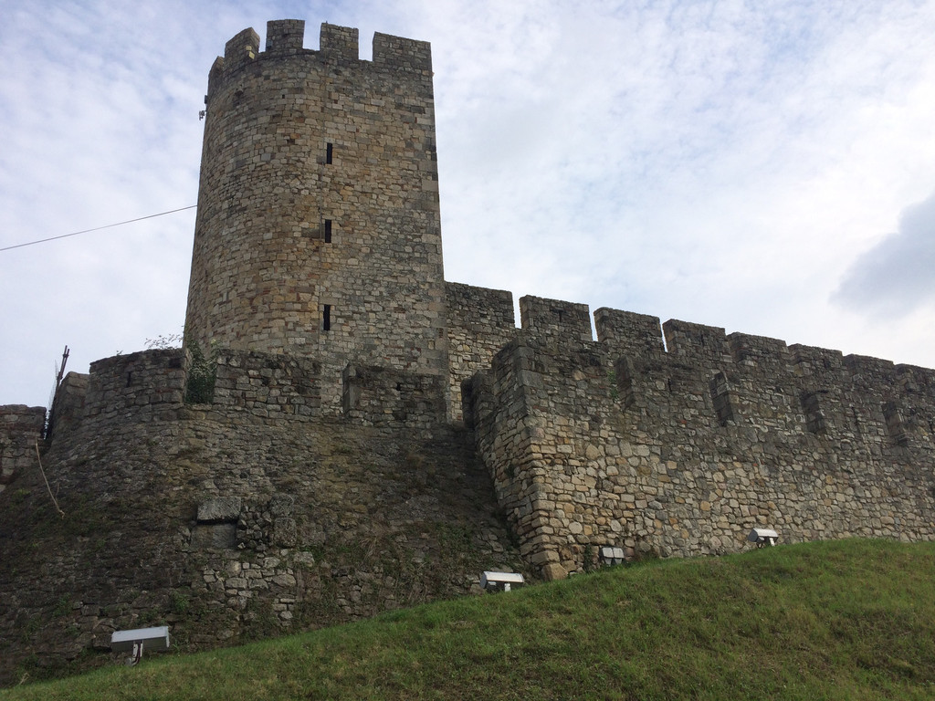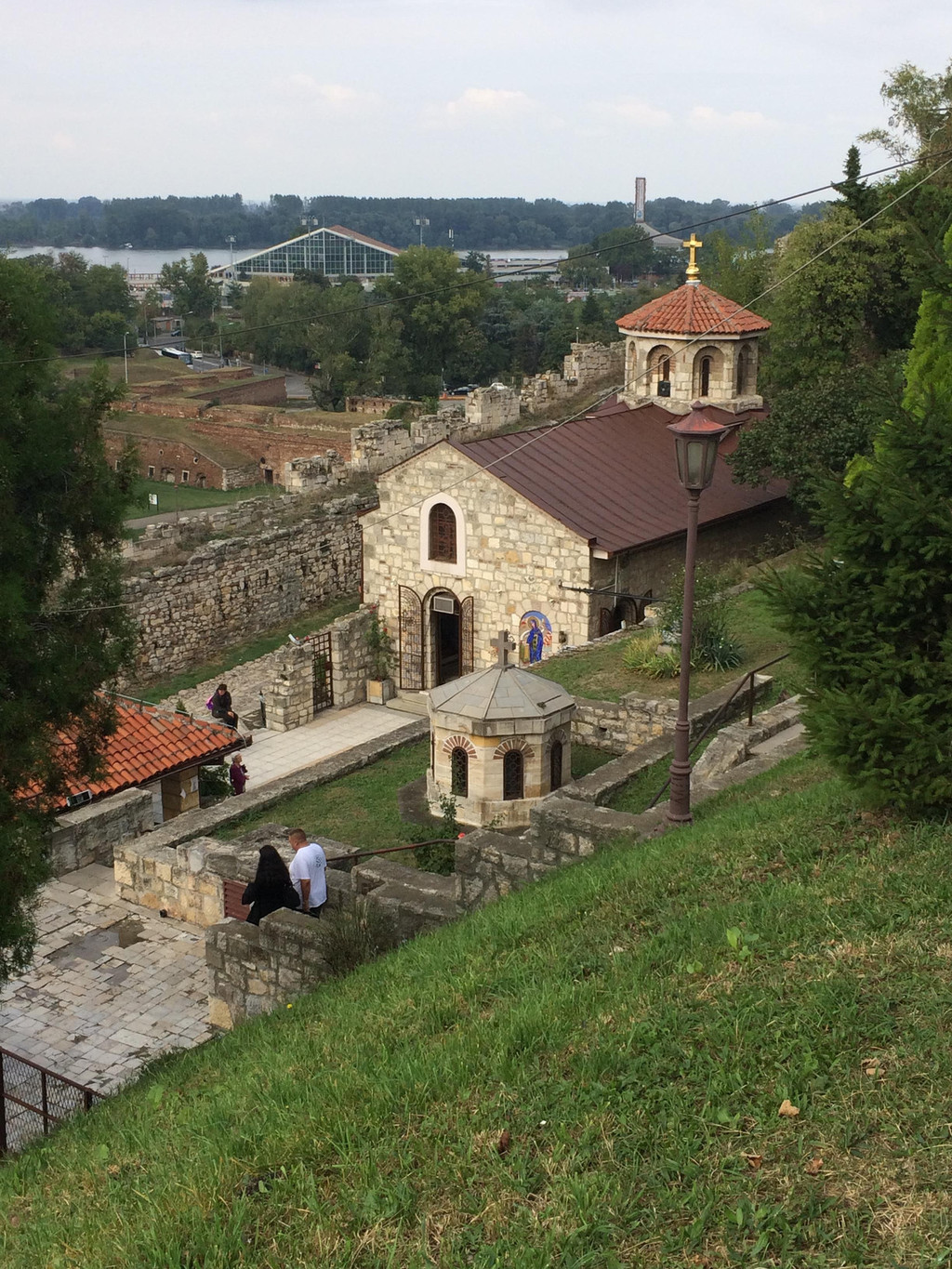 穿过尖塔下的拱形门洞就进入了城堡区,门洞的石头透着沧桑,这是山坡的顶部,从这里可以看到不远处两河交汇处,萨瓦河与多瑙河形成人字形分叉,左边的萨瓦河在此汇入多瑙河,