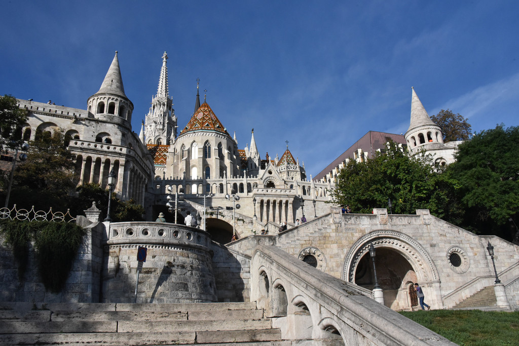 沿着台阶登上渔人堡,1895年为庆祝匈牙利族在此定居1000年而修建的平台,1902年建成,上面有7个尖顶建筑,代表了当初带领马扎儿人来到这里的7个部落首领(这是一组与英雄广场相互呼应的同一时期作品)。最初这里曾是卖鱼的鱼市场,在外敌入侵时这里居高临下成了天然防御工事,称为渔人堡,