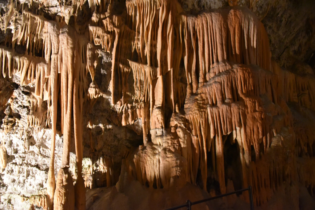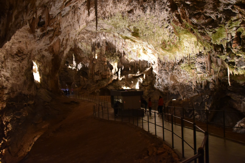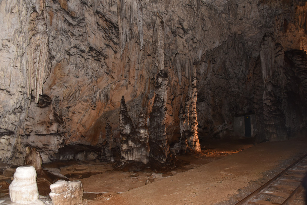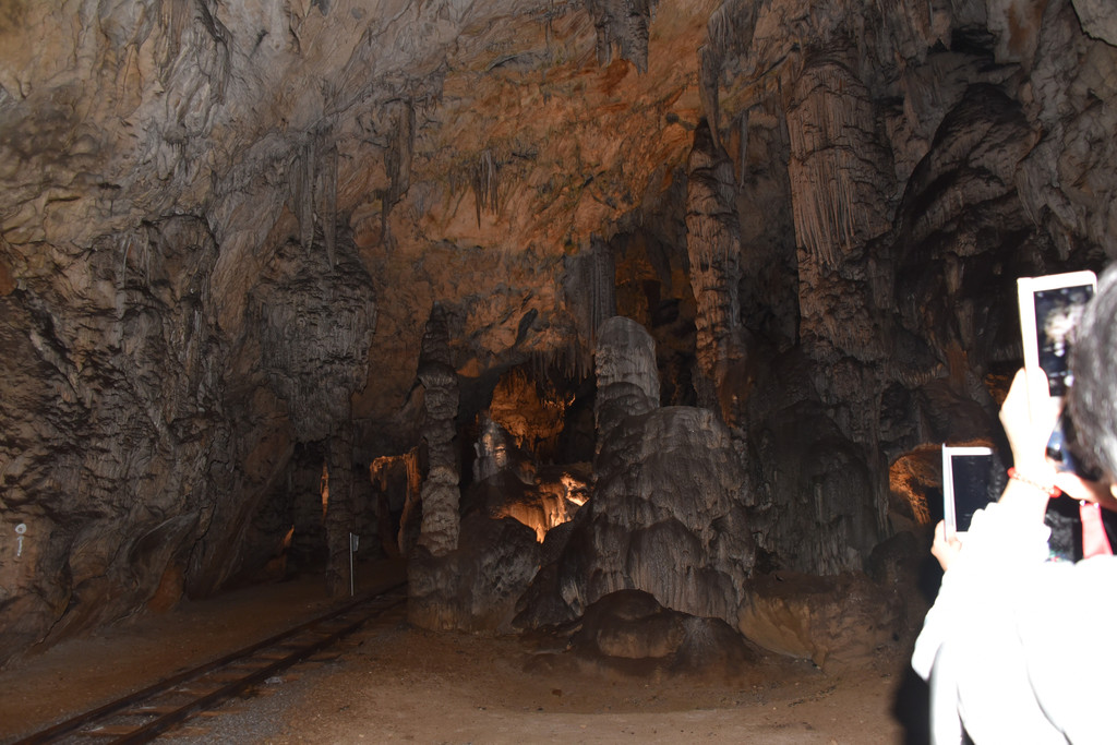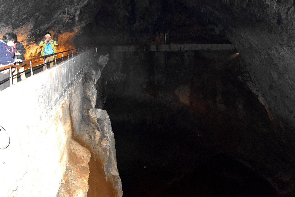 坐小火车出洞了,发现栏杆旁就是一条深邃的河,它就是这个洞的设计师和施工者,伊夫卡河,正是它亿万年的不懈努力造就了波斯托伊纳溶洞这个奇观。