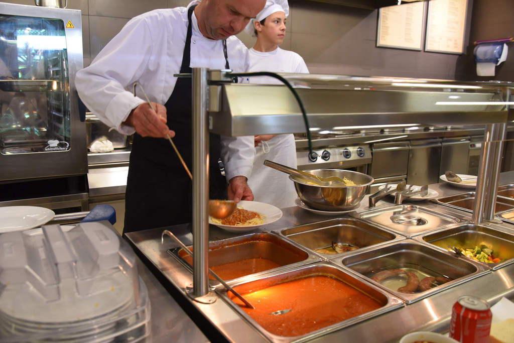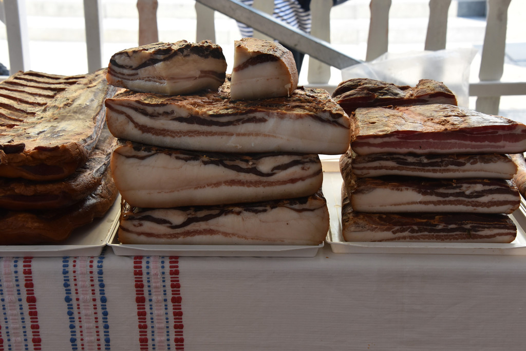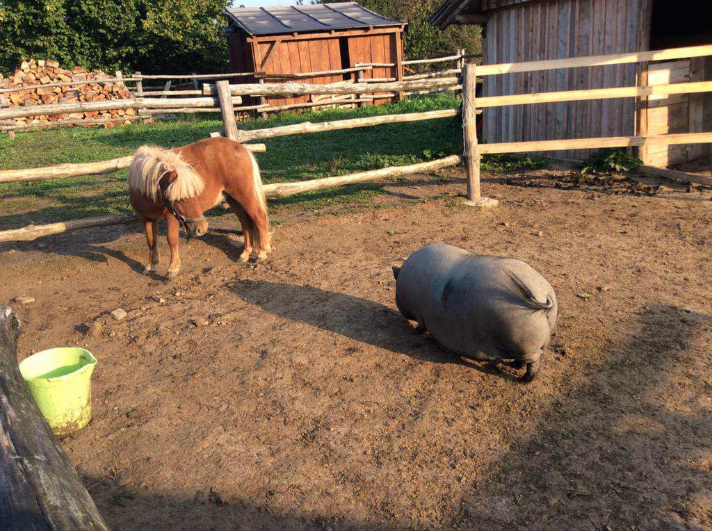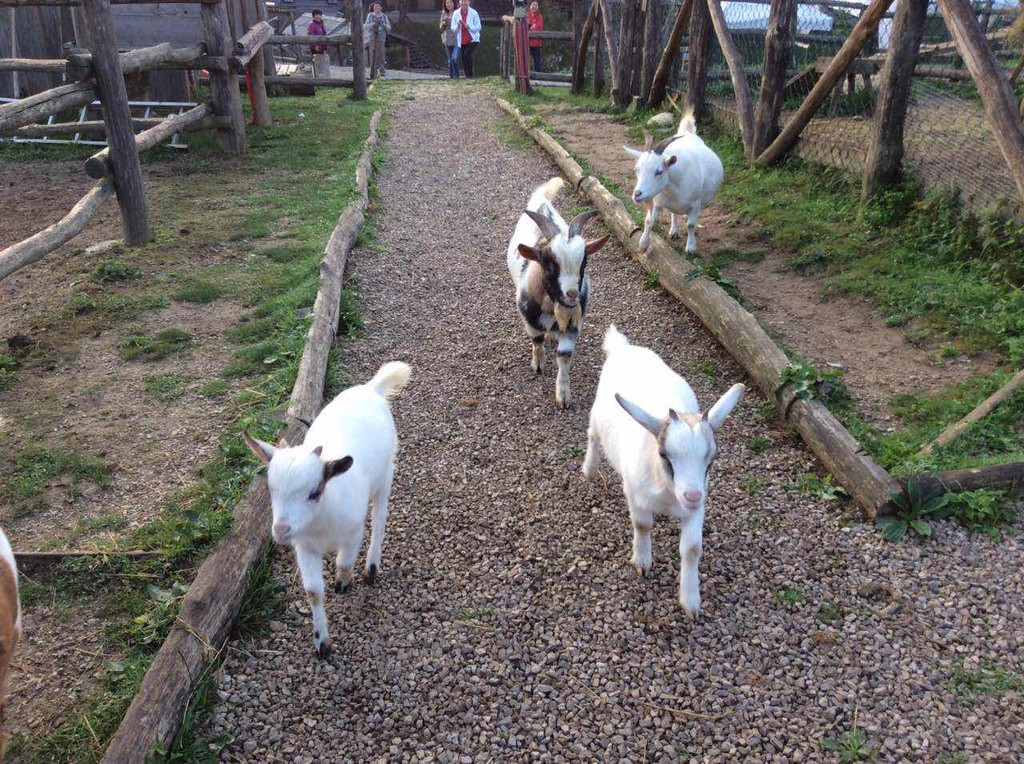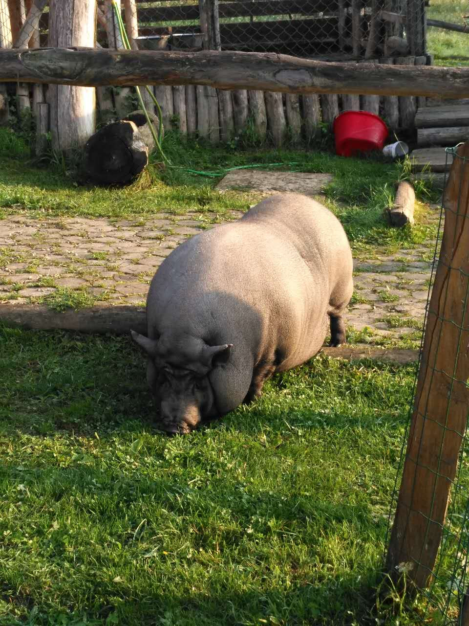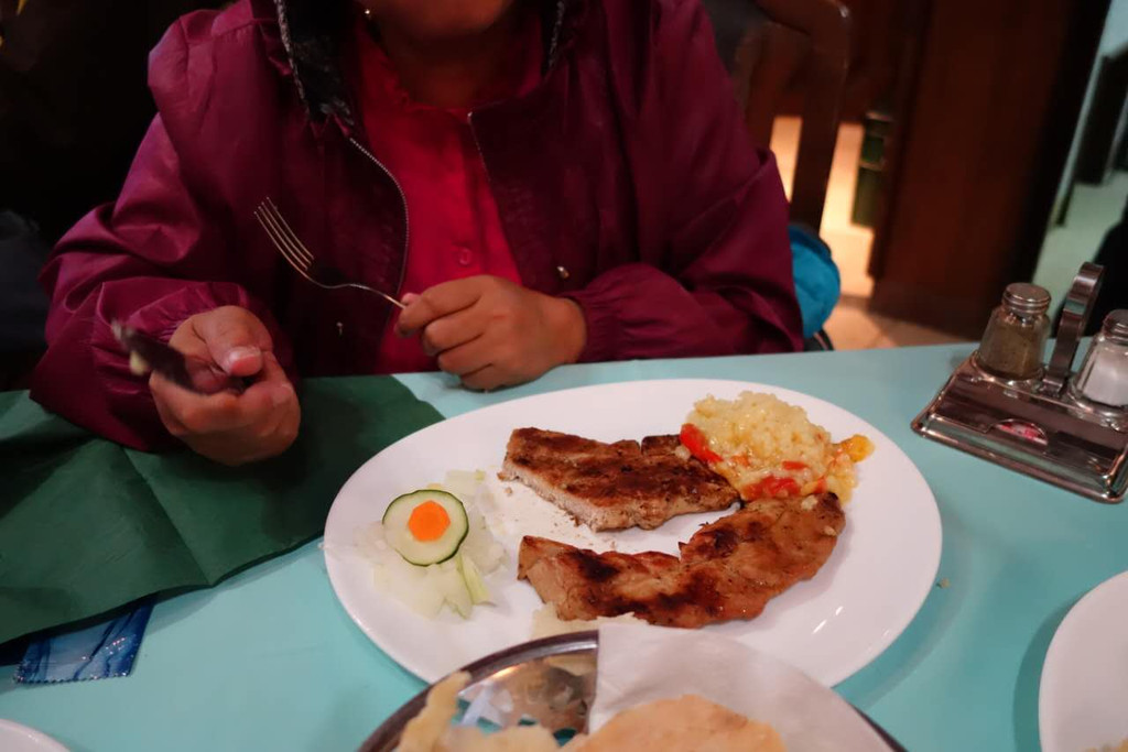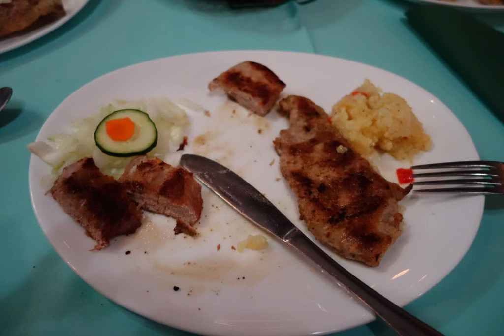 这是我们这次旅行中的第一顿西餐,塞尔维亚特色午餐,我们很期待。先上汤,大大的面包(其实就是一个大发面饼)每个桌上一盘,很多人饿的拿起大面包开吃,面包韧劲十足,我则先把汤喝完(很咸,碗底有些像方便面一样的短条),服务员把汤盘一一撤下开始上主菜,一盘大块儿的烤肉加少量蔬菜,用刀切,干干的切不动,用手撕也找不到下手的地方,咬一口孜然味,但吃不出是什么肉,同桌的芳芳问了服务员,好笑的是不用英语,而是手指那块肉向着服务员用疑问的眼神发出“咯咯咯?哞?”的声音,更加好笑的是服务员迅速理解了她的问题,用“哼哧,哼哧”的声音来回答,哦,是猪肉!那表情那声音顿时引起大家的哄笑。这个特色餐把我们镇住了,要是后面都这样吃可咋整。