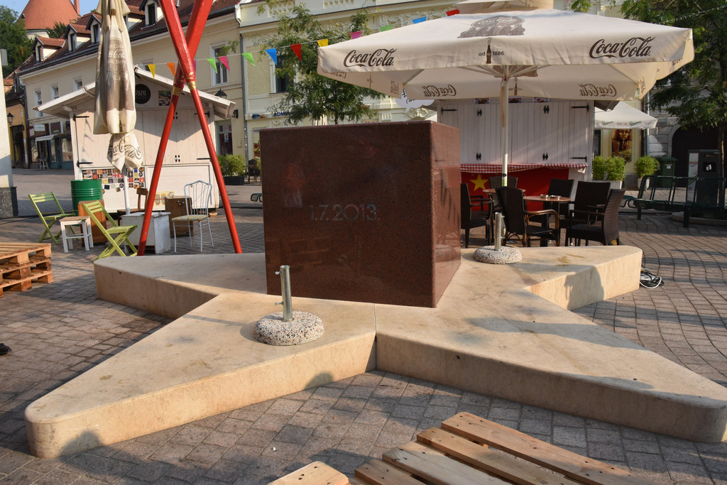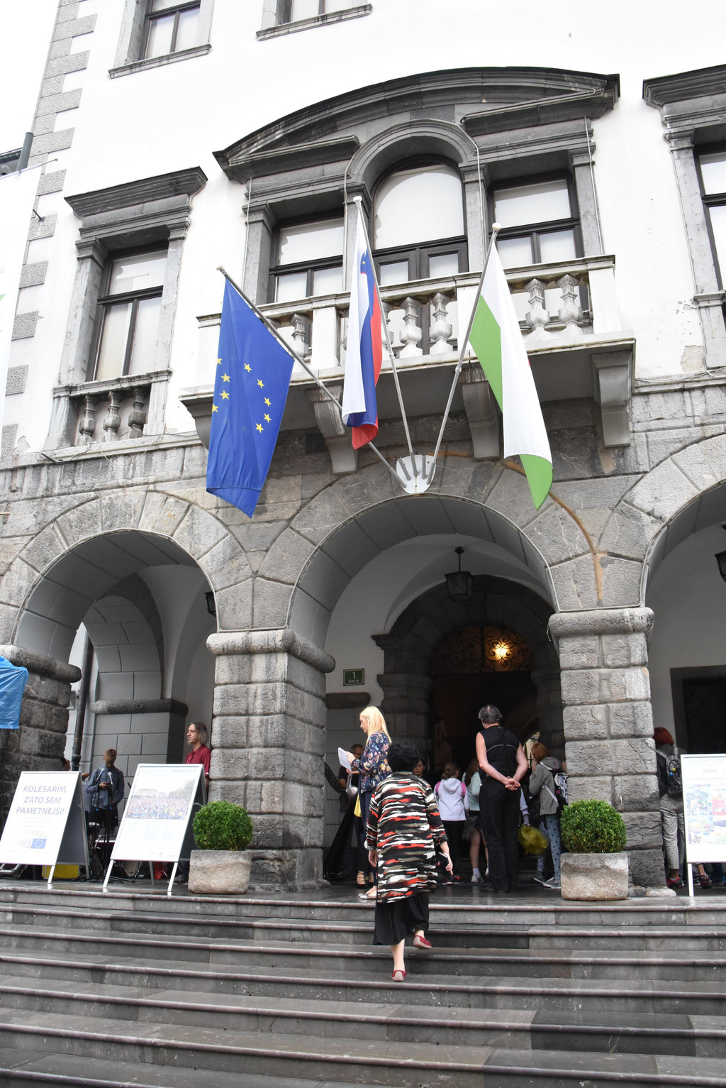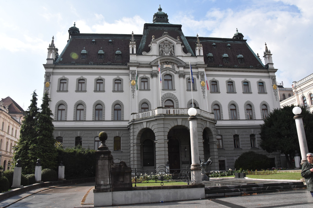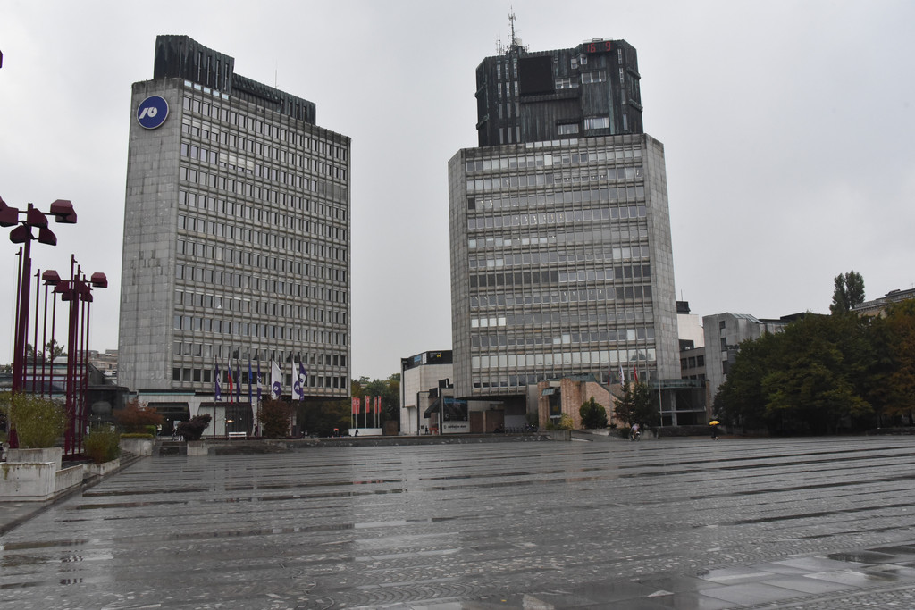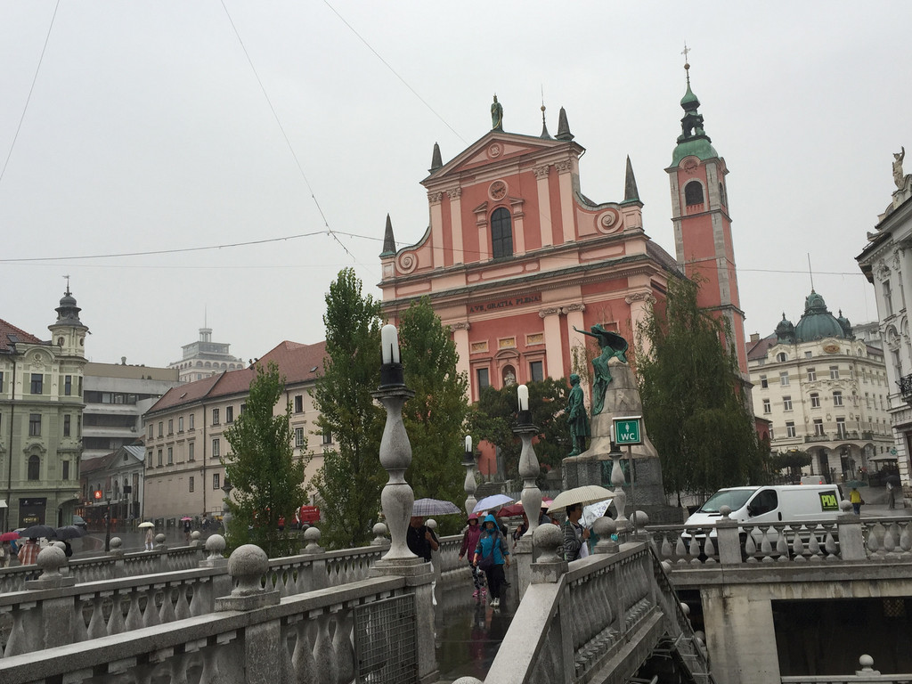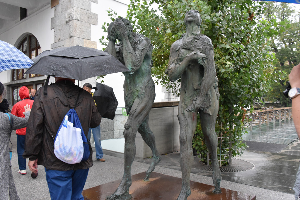 这一组相互呼应的艺术品顿时增添了无限的故事性。三重桥的对面是共和国广场,我们冒雨前行,共和国广场主要建筑就是市政厅大楼,1991年6月25日,就在这个广场上宣布了斯洛文尼亚的独立,