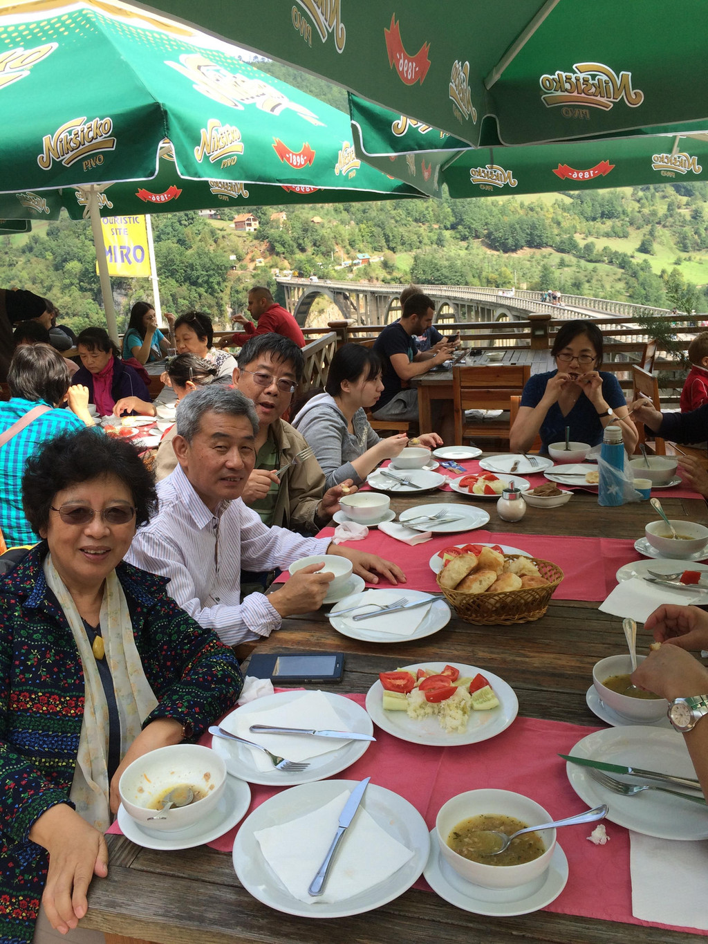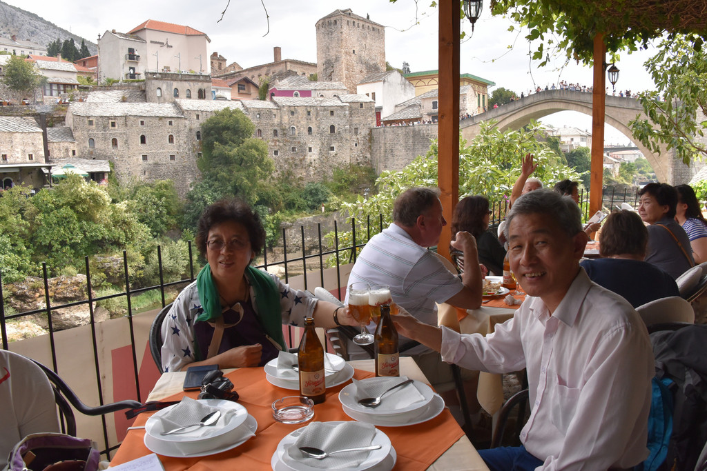 午餐就在桥头的餐厅,在桥旁吃着午餐观着桥边风景,想象着当年盖世太保在桥头设的岗哨的位置,想象着牺牲的游击队员从桥上掉下,想象着工程师按下炸药点火装置的一瞬,看到如今的桥,看到桥两侧和平的景象,亲手触摸桥,让我们非常感慨,这就是历史,我们的南斯拉夫情结今天得以满足。