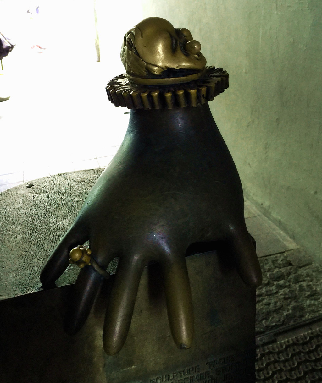 这个过道中有一个水泥桩,上面有一个胖胖的手的雕像,手指上戴着戒指,戒指和手腕上都是造型古怪的小人头,祯祯发现地上还有,看脚下,还有几个铜制的疙里疙瘩的东西,