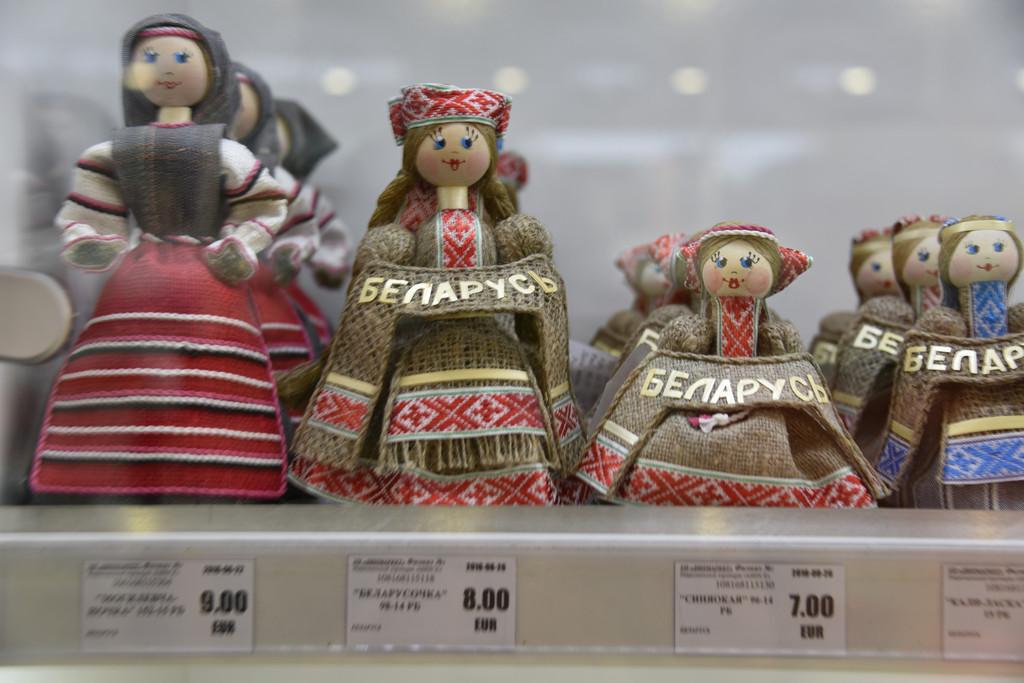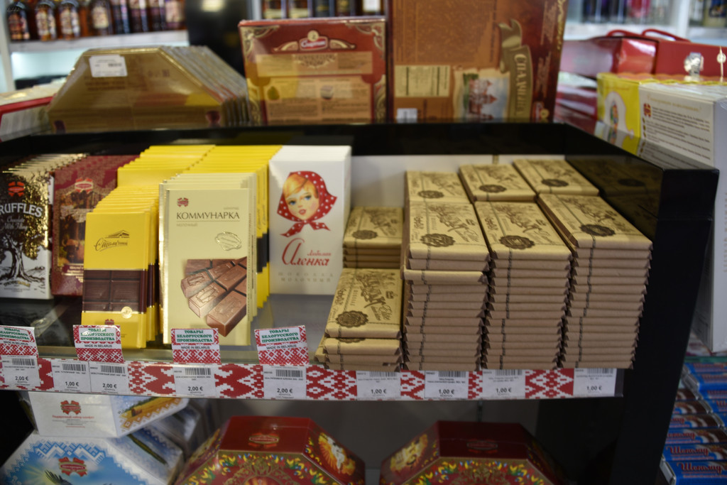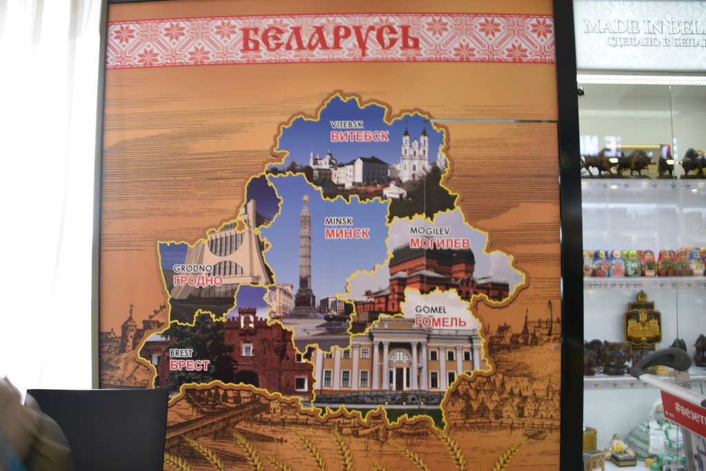 起飞8小时后在明斯克机场停留90分钟,机场等候的区域虽然狭小,但异域风情浓郁,套娃、瓷盘、民族服装的布偶,各种工艺品也够欣赏一阵子,浓度90%的黑巧克力只要1欧元,包装简朴,价格实惠,果断收了。这张白俄罗斯的地图应该是贴对了地方的最好的广告,与广告和一张影,也算脚踩在白俄罗斯的土地上了。