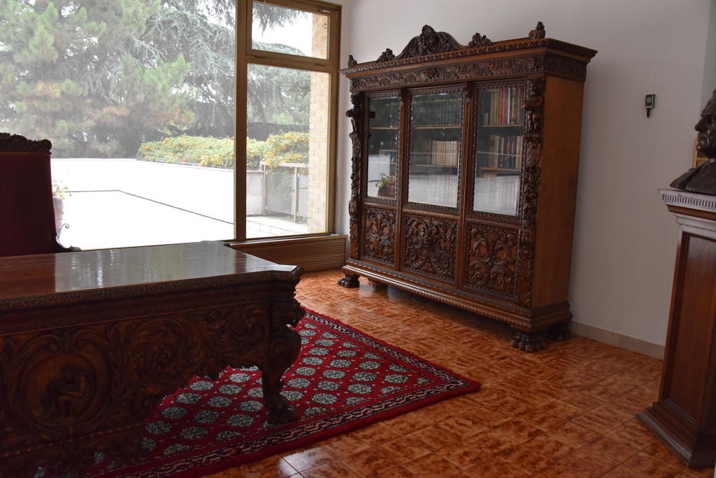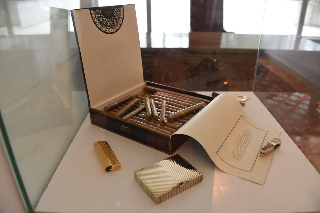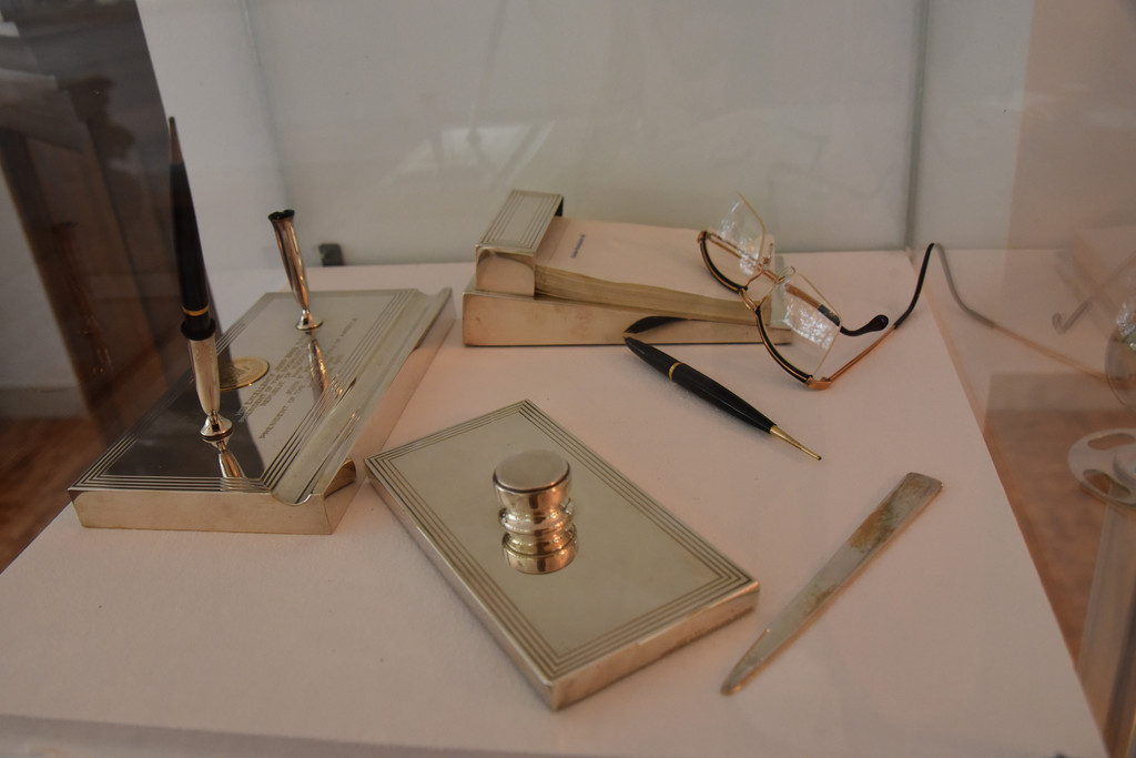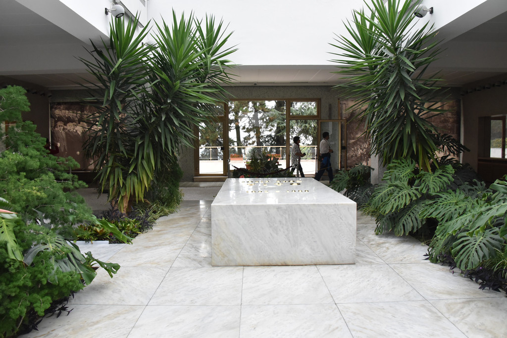 这个墓地实际上是铁托生前工作和休闲的地方,中间是花房,右侧是办公区,左侧是生活区,右侧有他生前使用的巨大的写字台,书柜,这部分还展示着他生前使用的笔纸眼镜以及雪茄烟,另一侧展示着铁托生前收到的各国赠予的火炬礼品有近百个,他的元帅服挂在玻璃柜中,整个墓地显得明亮肃穆简单低调。