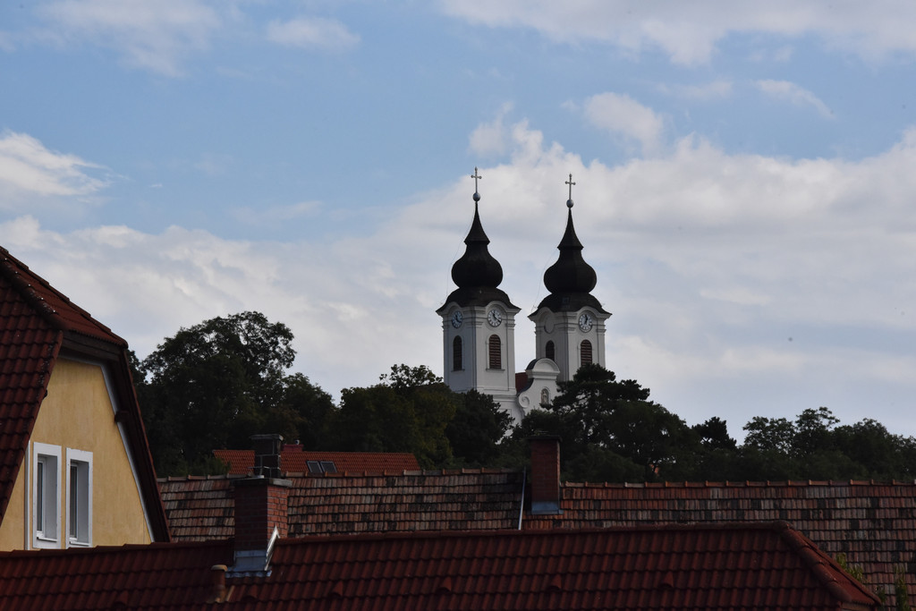 山顶上就是那座地标式建筑,巴拉顿修道院,旁边的标牌大致讲述了它的历史,“提哈尼本笃会修道院建于1055年。提哈尼本笃会修道院最早出现在匈牙利语中,爱德华一世国王就埋在这里的地下室,18世纪在此上建立的教堂是当时匈牙利典型的巴洛克建筑,匈牙利末代国王查尔斯四世和他的王后在这里度过了他们最后的时光”。