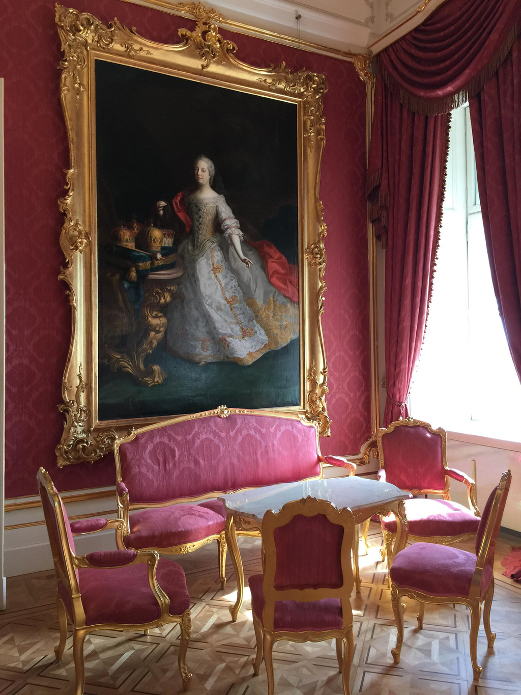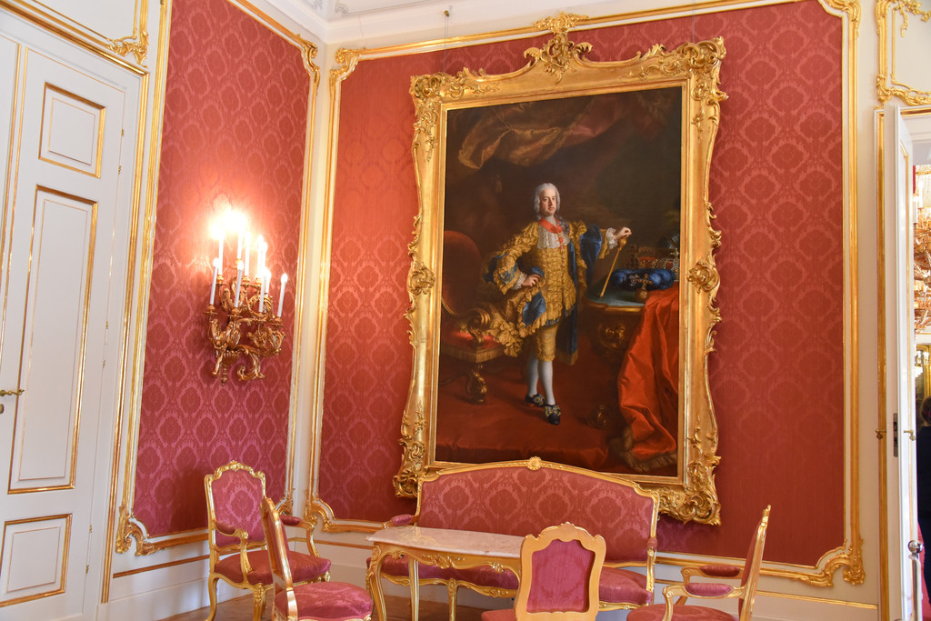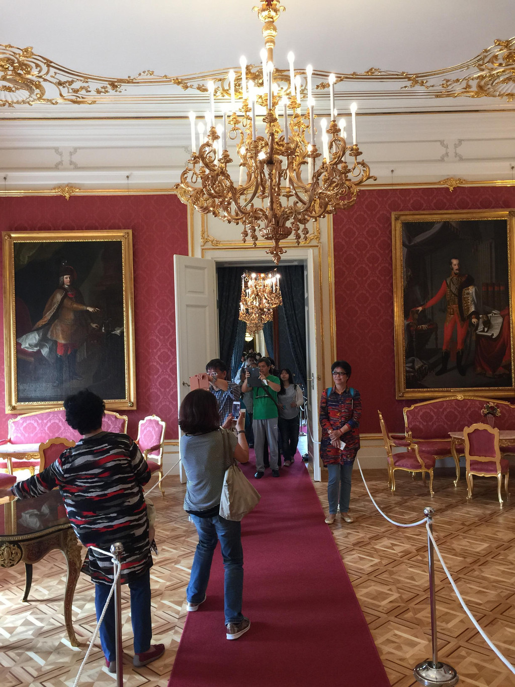 红色房间,所有的装饰全部是玫瑰红色,与前几个房间不同,这里墙上挂着大幅的人物油画,墙上也增加了仿蜡烛台的壁灯,显得庄重温馨。