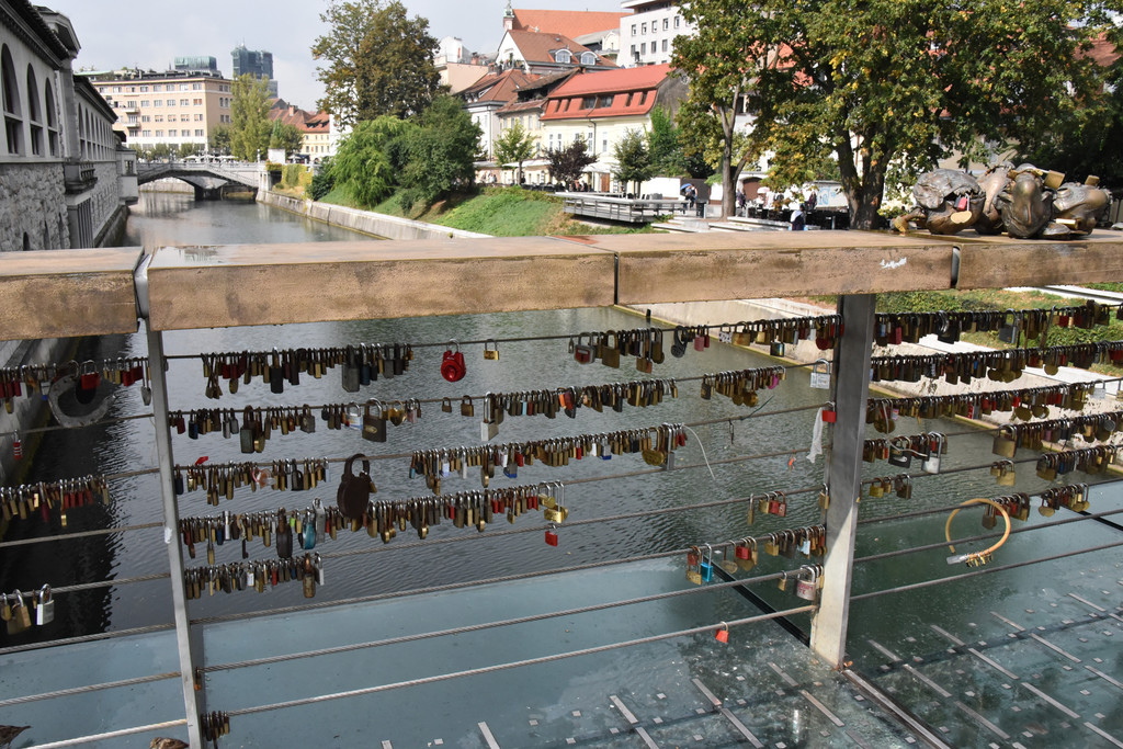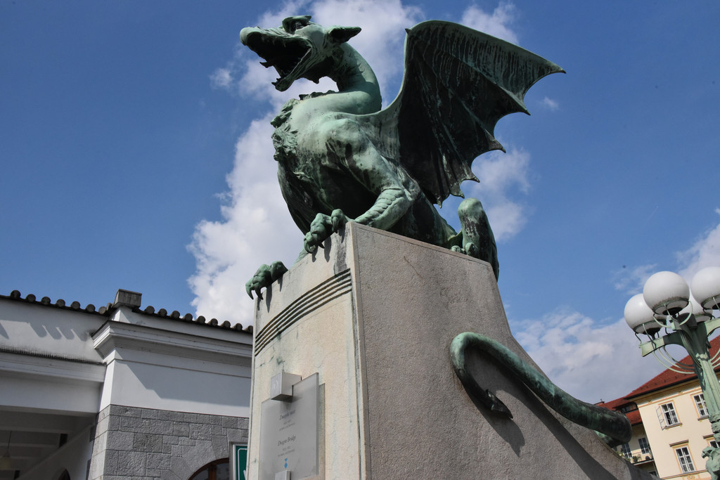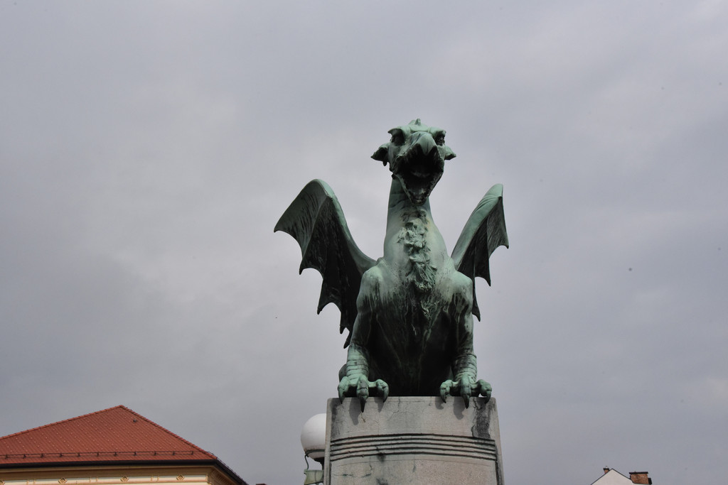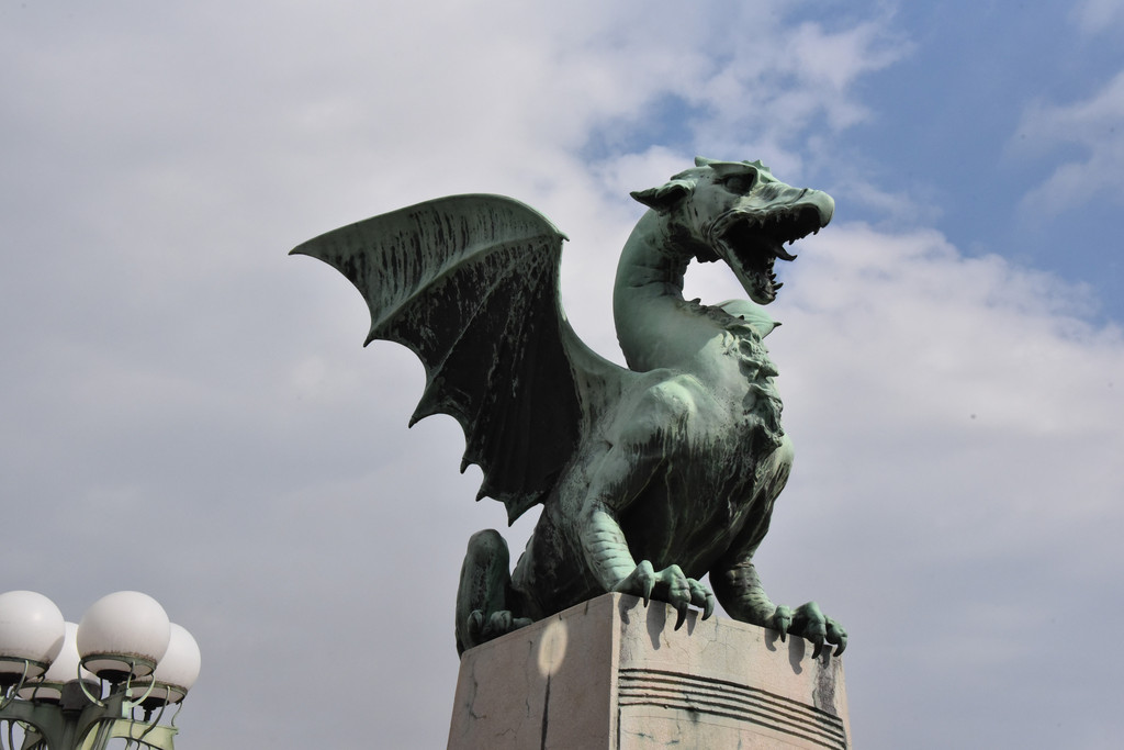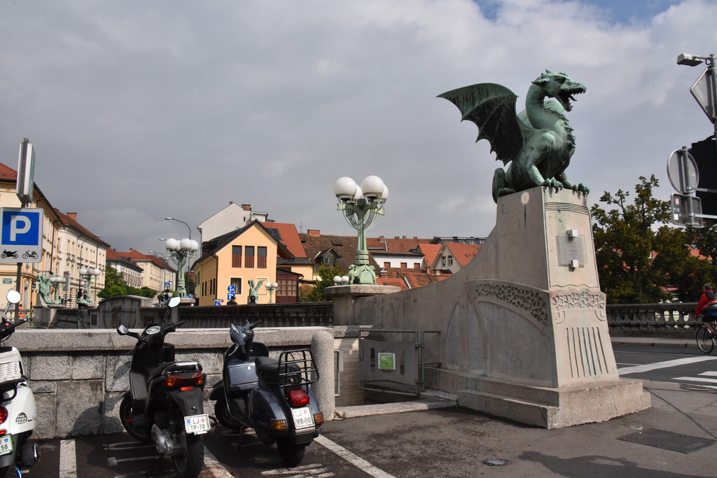 卢布尔雅那是一个新兴的城市,也是欧洲的非主流艺术中心。城市中一条河卢布尔雅那河,游览从河上的龙桥开始,龙桥是卢布尔雅那地标性建筑,桥栏杆上标着1848-1888年建成,桥头4个角各蹲着一只青铜色的长着翅膀的龙,两只利爪按住桥头,张着长满牙齿的嘴巴,两扇类似蝙蝠翅膀的翅膀呼扇着,一条尾巴盘住桥头,样子很凶。