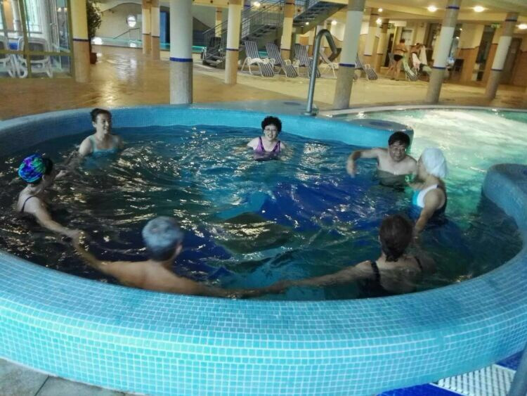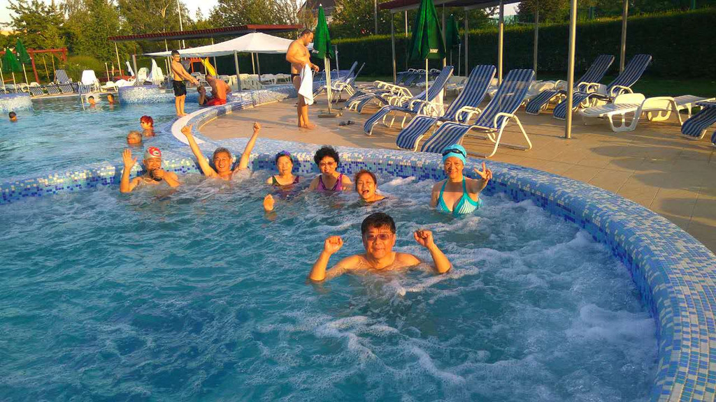 看到SPA真高兴,知道行程中有泡温泉,就是这里了?入住酒店,房间里每个床上都摆放着浴巾和浴袍,仔细看看房间的说明,入住酒店可以免费享受的项目有:游泳、SPA、桑拿、芬兰桑拿、蒸汽浴、冰洞、水流按摩等等,闲话少说,换上泳装出门!楼下有室外游泳池,气泡池,大家又聚在一起了,