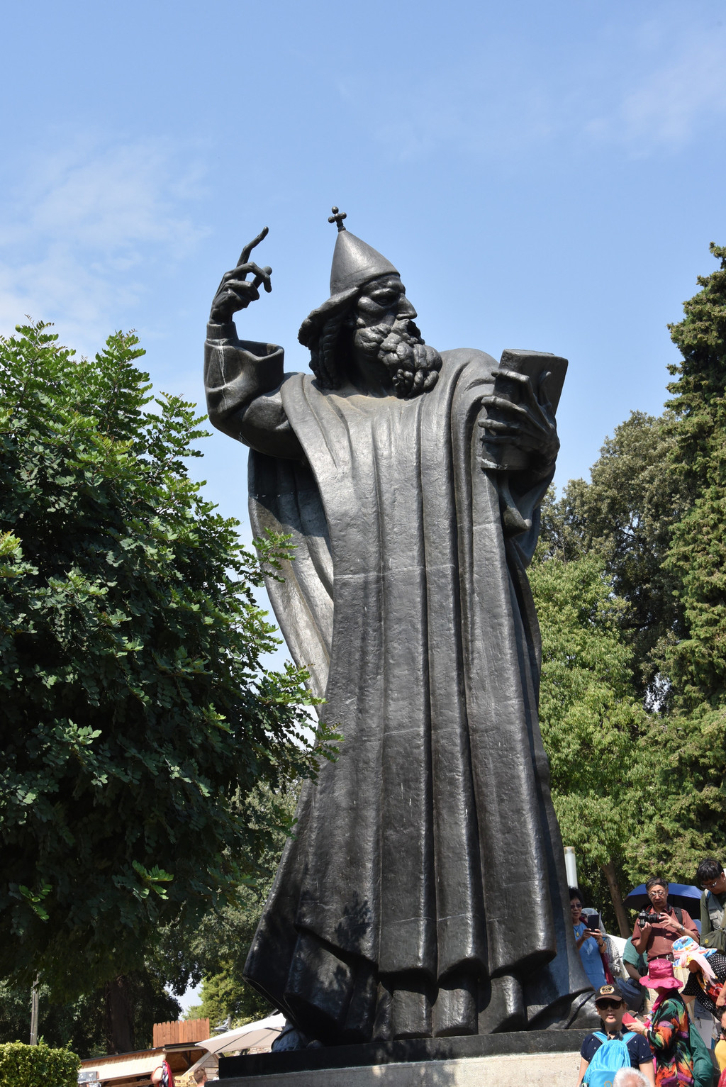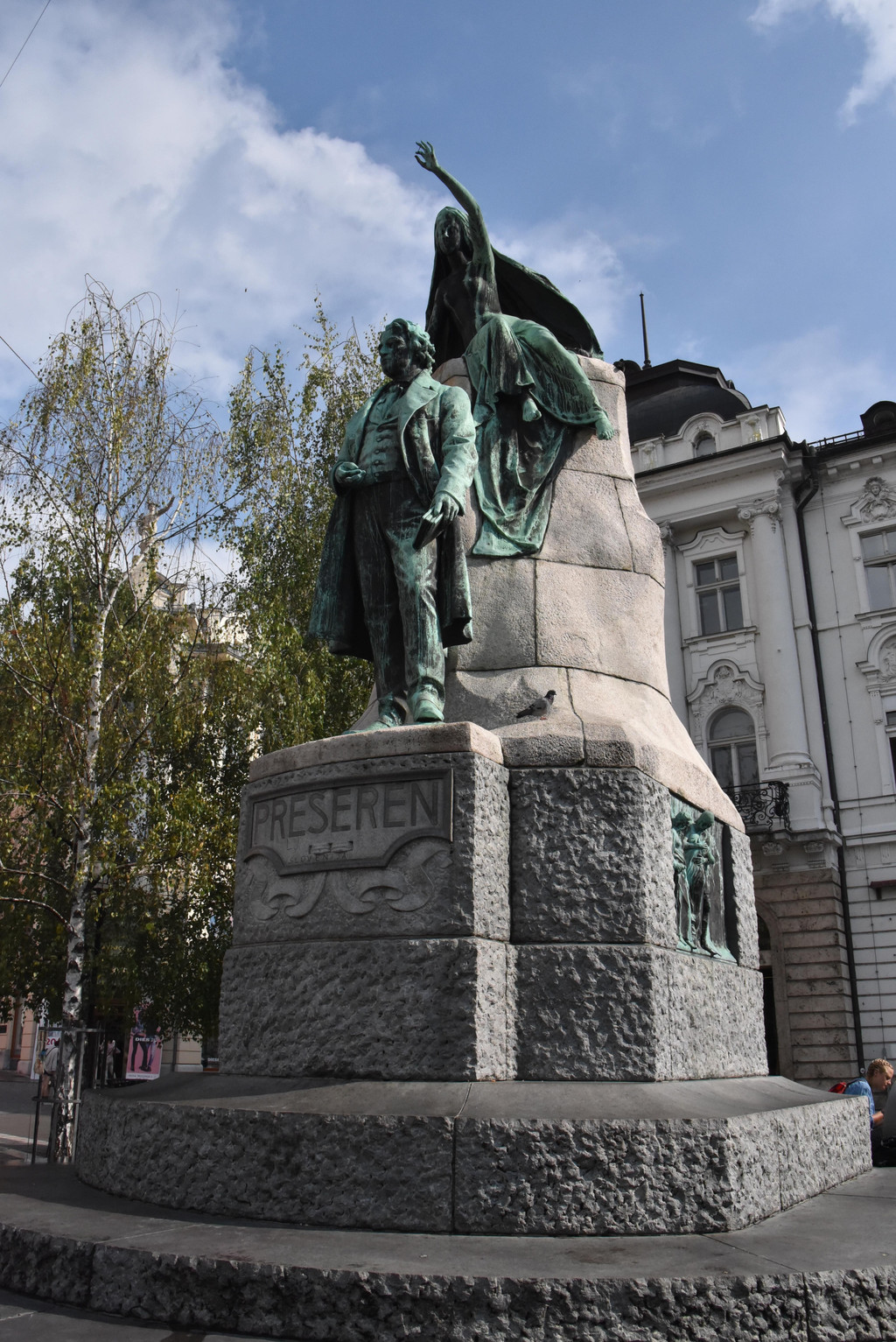 在三重桥的旁边一个小广场,立着一尊铜雕像,这是斯洛文尼亚的著名诗人普列舍文,出生于1800年,斯洛文尼亚的国歌就是根据他的诗谱的曲(当太阳升起的时候,这世界没有战争,我们每一个人都是自由的灵魂),他的铜像背后还有一个身穿巨大斗篷的女子坐在他身后的石柱上向前挥着手,有说她是女神,也有说她是普列舍文心中的女神,
