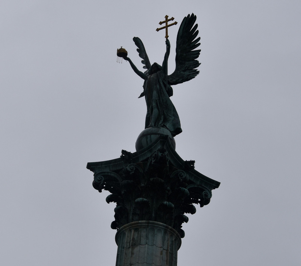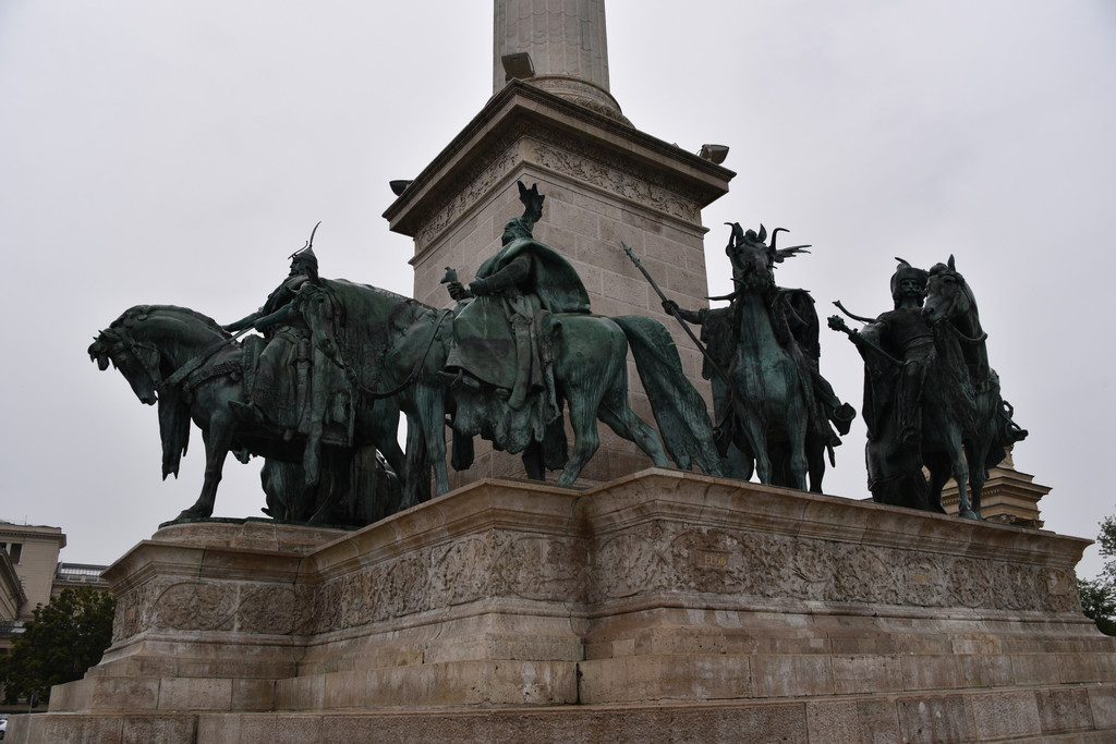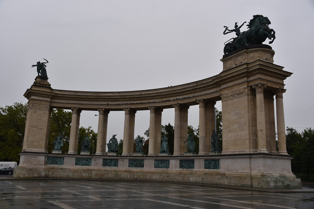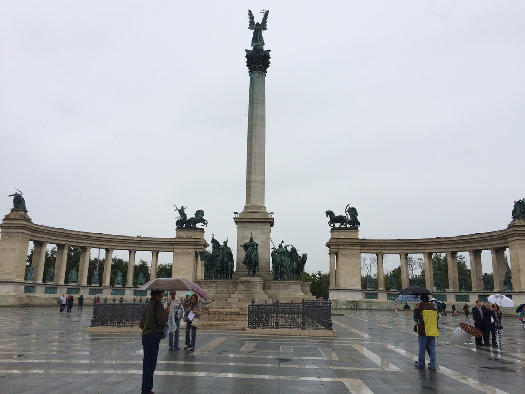 英雄广场,这是每次到布达佩斯必到的景点,上次来时阳光灿烂晒得人很难受,这次好了,下雨,小雨中可以轻松漫步,只是照起相来既麻烦也不好看,还是仔细浏览一下历史吧。匈牙利的历史不算长,这块地方公元4世纪到8世纪期间基本是游牧民族居住,后逐渐形成几个小的公国,公元9世纪,公国中的一位皇帝想借外来之力打败其他公国,从东北方引来了游牧民族马扎儿人,马扎儿人共有7个部落,骁勇善战,他们推举一位阿尔帕德大公为首领,于公元896年越过喀尔巴阡山脉,荡平了这片土地的弱小公国,开始定居在这片土地上(是不是有点儿像引狼入室),游牧民族总是不安定的,他们在欧洲到处出击,被周边的欧洲国家视为祸害,要联合讨伐,为了生存,阿尔帕德的曾孙盖佐继承王位后与家人皈依了天主教。以获得周边天主教国家的认可,盖佐的儿子史蒂芬997年继位后,征服了其他争夺首领地位的对手,向罗马教廷申请并获得了王权标志,使匈牙利正式转为基督教国家。让匈牙利这个民族融入欧洲,这在当时无疑是一个相当正确的决定。史蒂芬在公元1000年加冕为王,将部落的形式改为国家的形式,他就是匈牙利的圣伊斯特万一世皇帝,英雄广场是匈牙利人于1896年为纪念定居1000周年修建的,也称千禧广场,英雄广场中间是一个高36米的纪念柱,纪念柱下面是7位骑马的勇士雕像,他们就是马扎儿人的7个部落首领,领头的当然就是那位阿尔帕德大公,没有他们就没有今天的匈牙利,