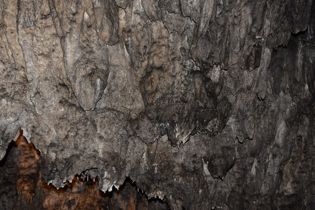 这是一片巨大的钟乳钙华,洞顶垂下的是一片一片的石幔,薄且小,