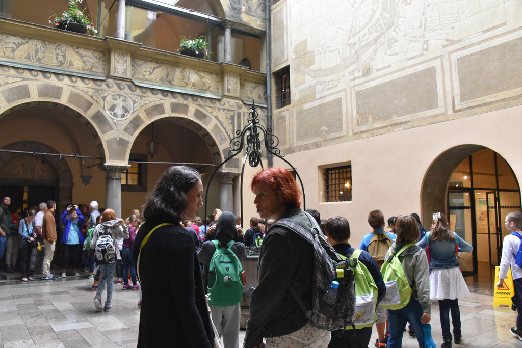团队在这里解散自由活动了,大家迅速分成几拨,购物的,观景的,观景加购物的。我属于先观景有物随时购那拨的。接着刚才的游览,看看是否可以进到这个旧的市政厅中,这里现在是博物馆,看到有人随便进出,我们也跟着往里走,没有遇到阻拦,进去是一个天井,有集体参观的队伍,我们只是浏览一下四周,四周摆放着很多展品,是这里的老物件和一些创意小品。