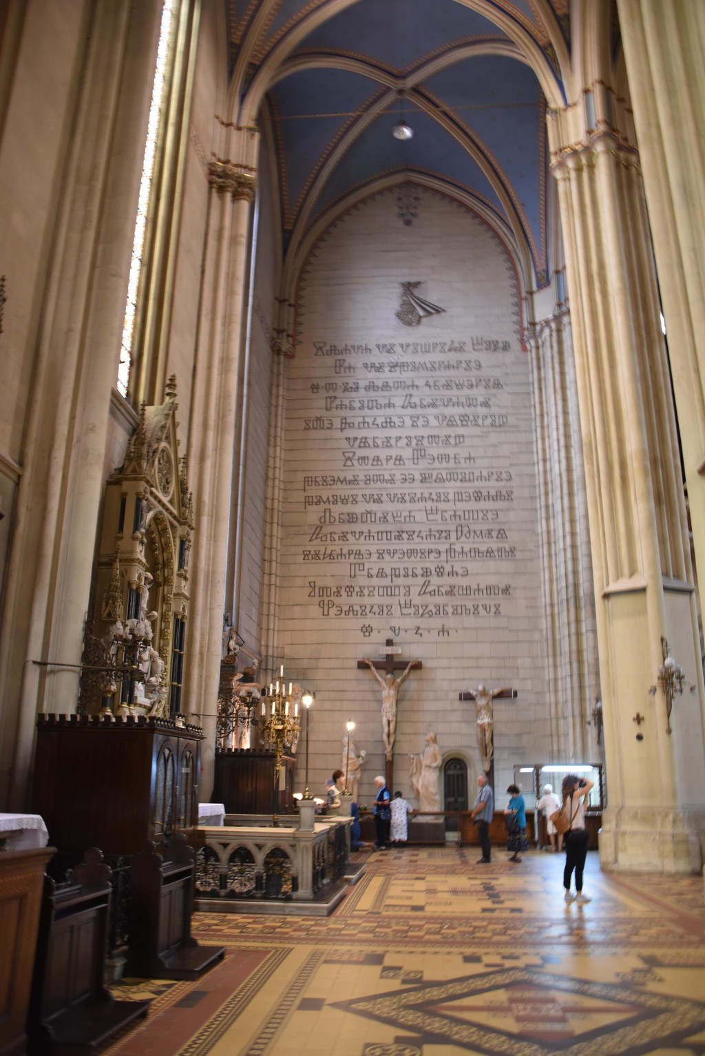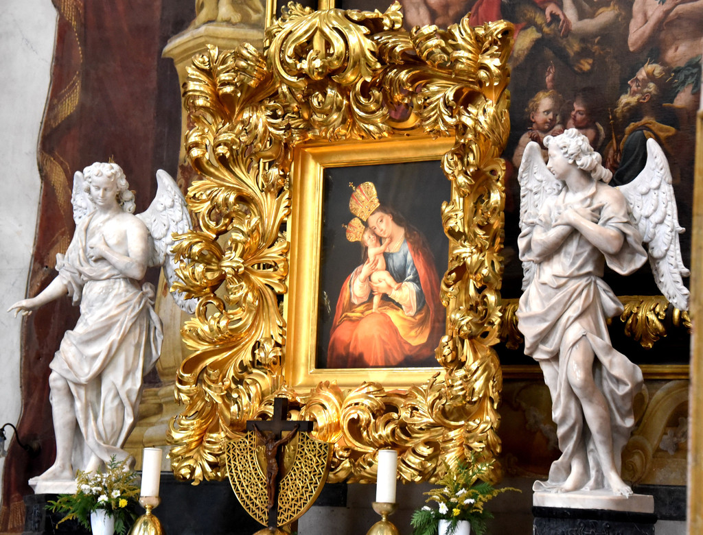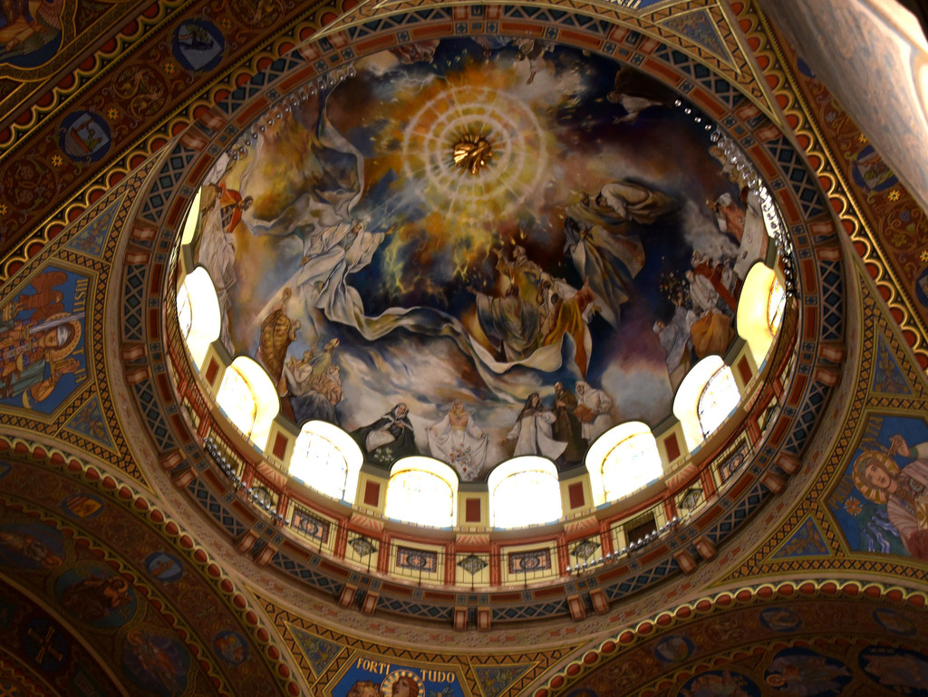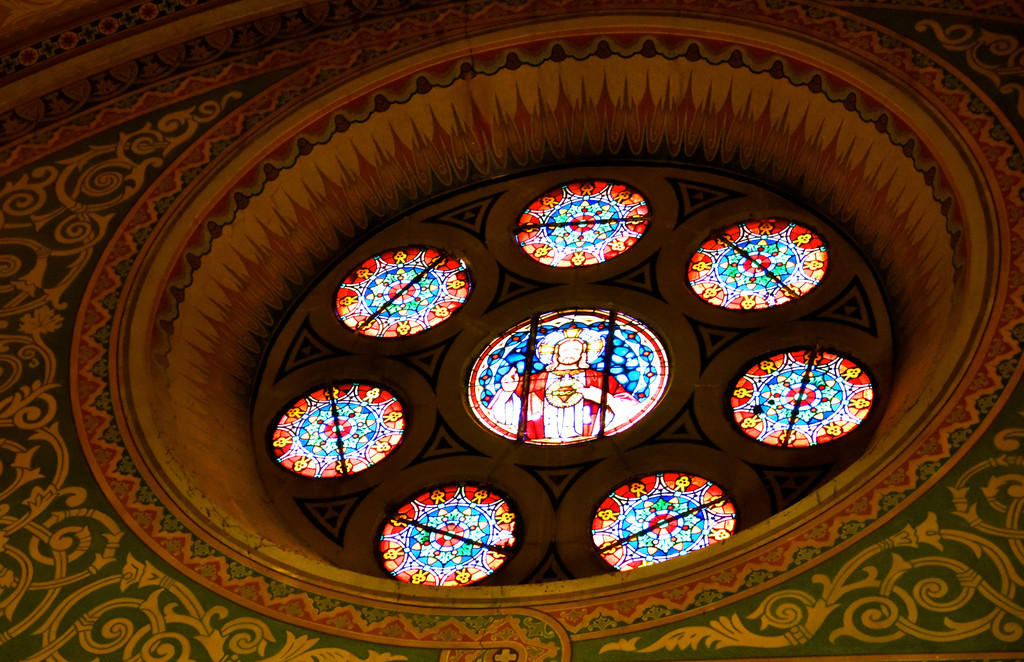 从侧门进入教堂,里面装潢非常精美,拱形建筑的穹顶用彩色和金色描绘着圣经故事,彩色玫瑰花窗上的圣经人物和不留空白的墙面装饰,都让教堂显得富丽堂皇。两侧几个祭坛分别是基督和圣母,