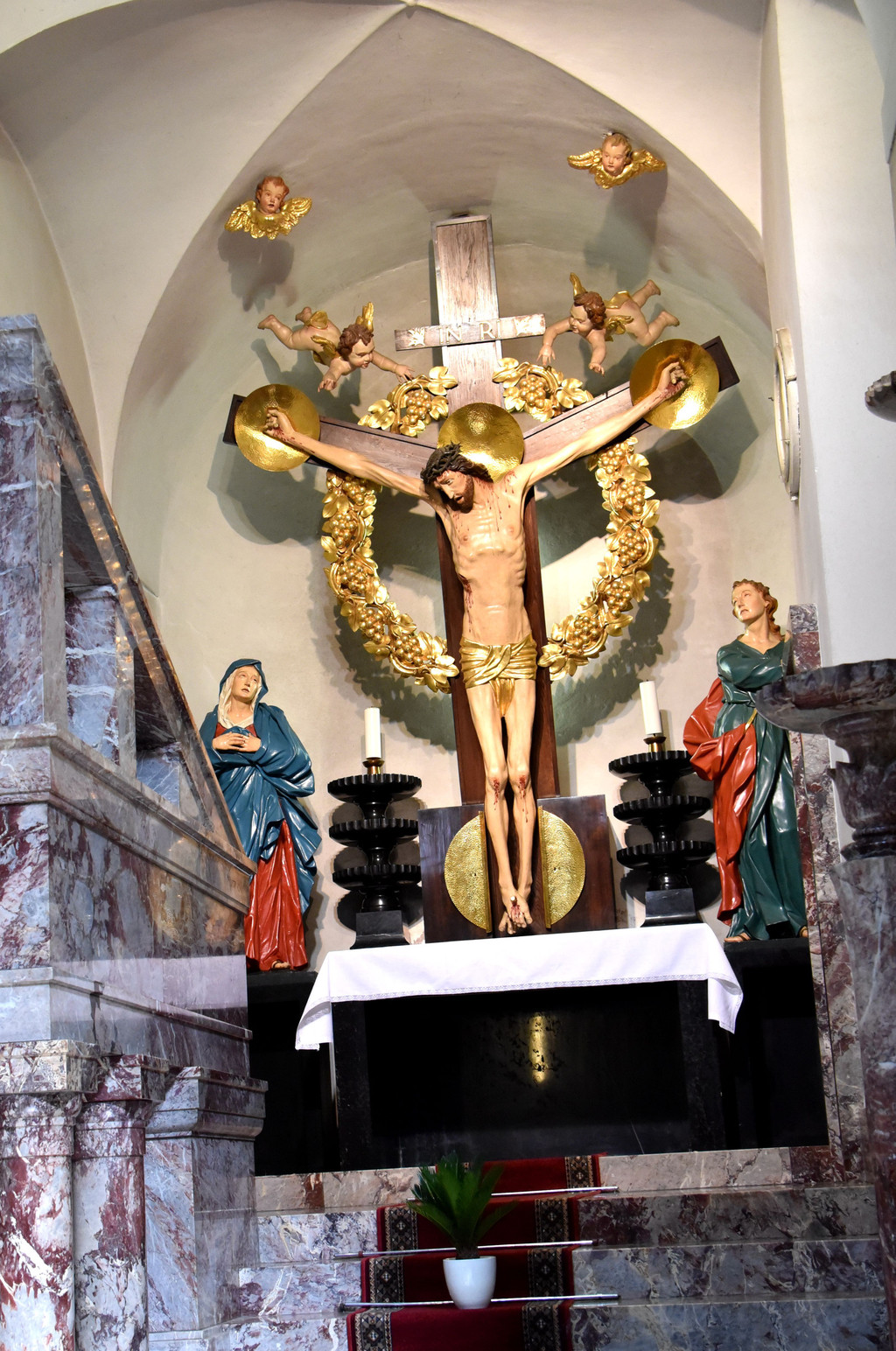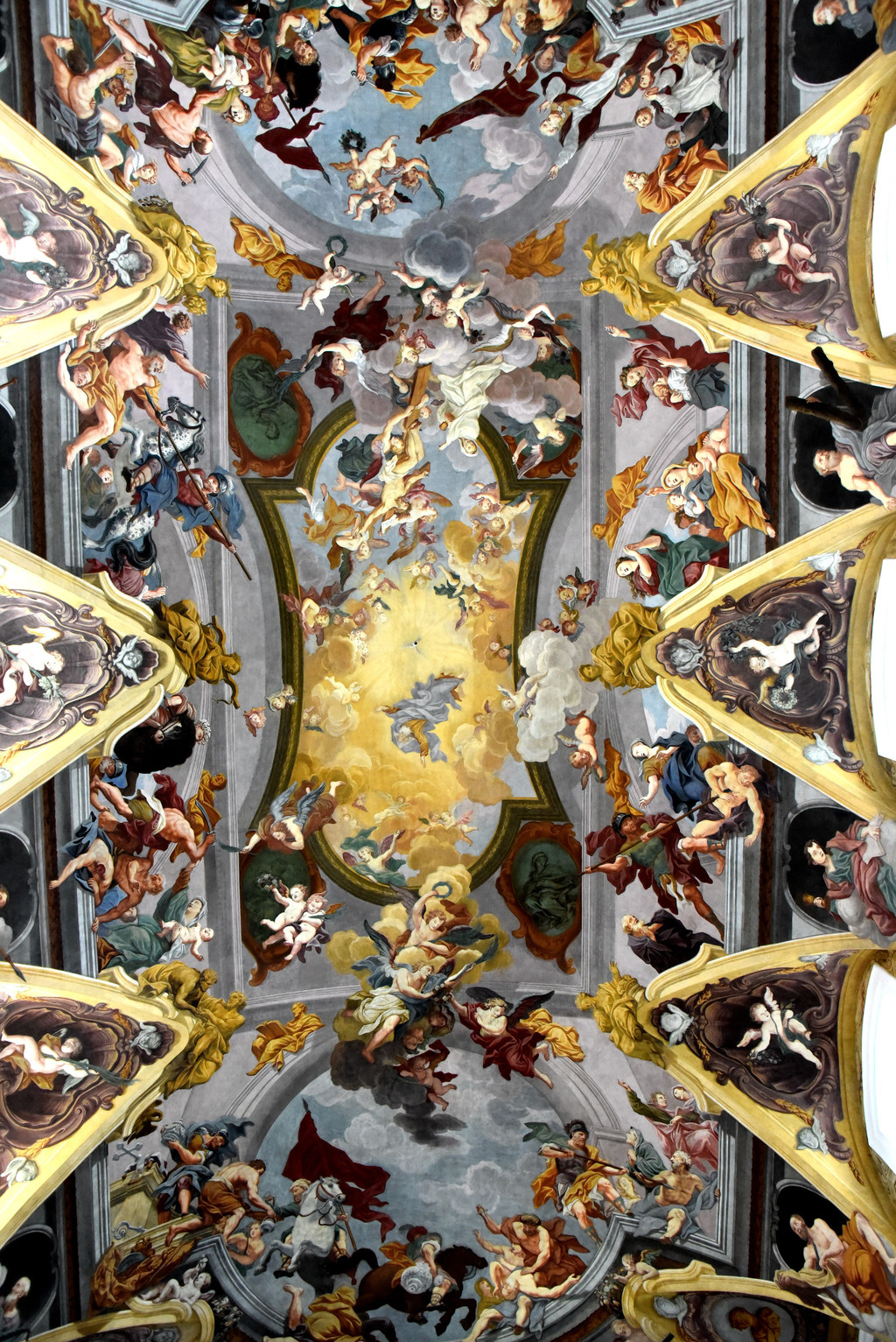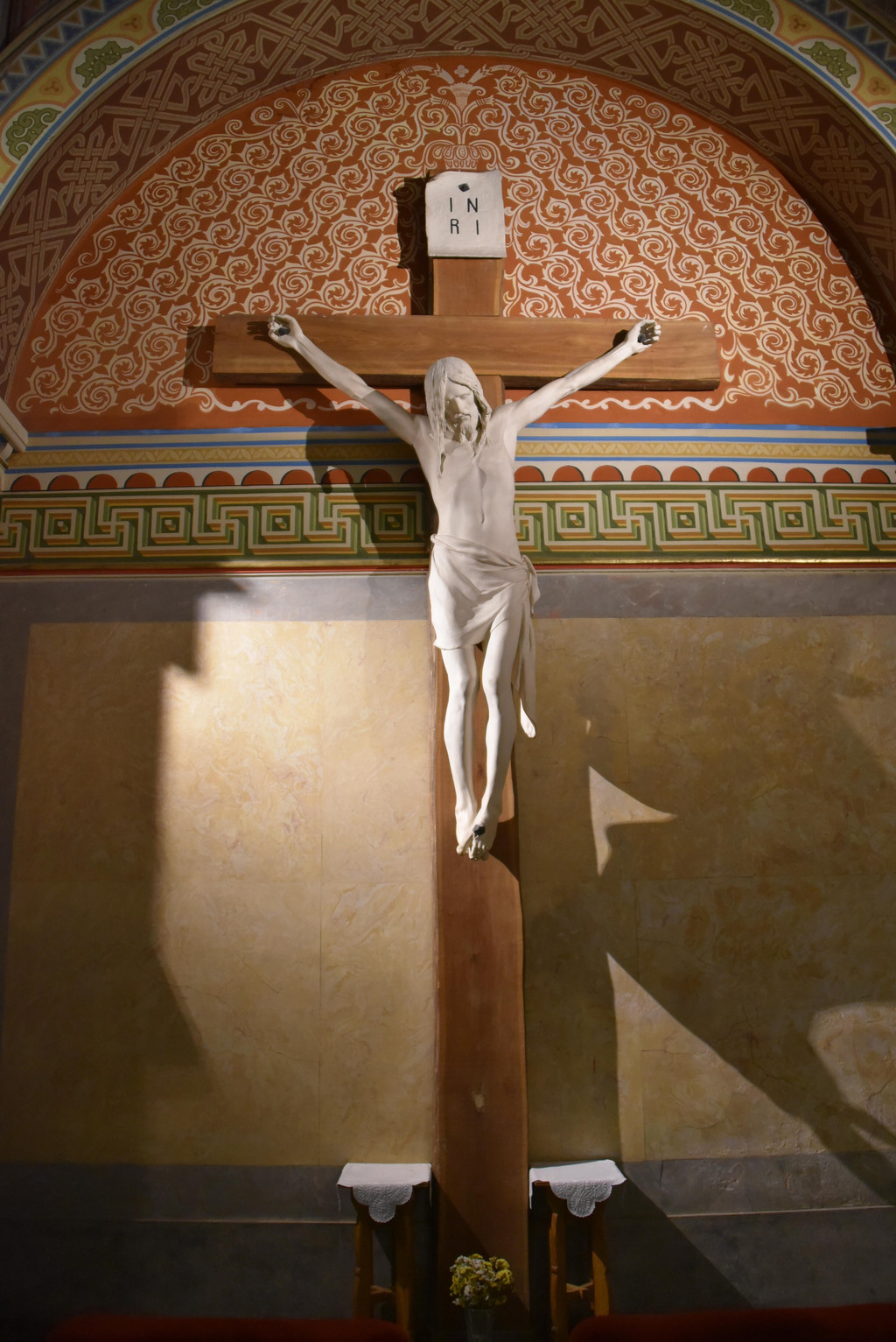 从侧门进入教堂,里面装潢非常精美,拱形建筑的穹顶用彩色和金色描绘着圣经故事,彩色玫瑰花窗上的圣经人物和不留空白的墙面装饰,都让教堂显得富丽堂皇。两侧几个祭坛分别是基督和圣母,