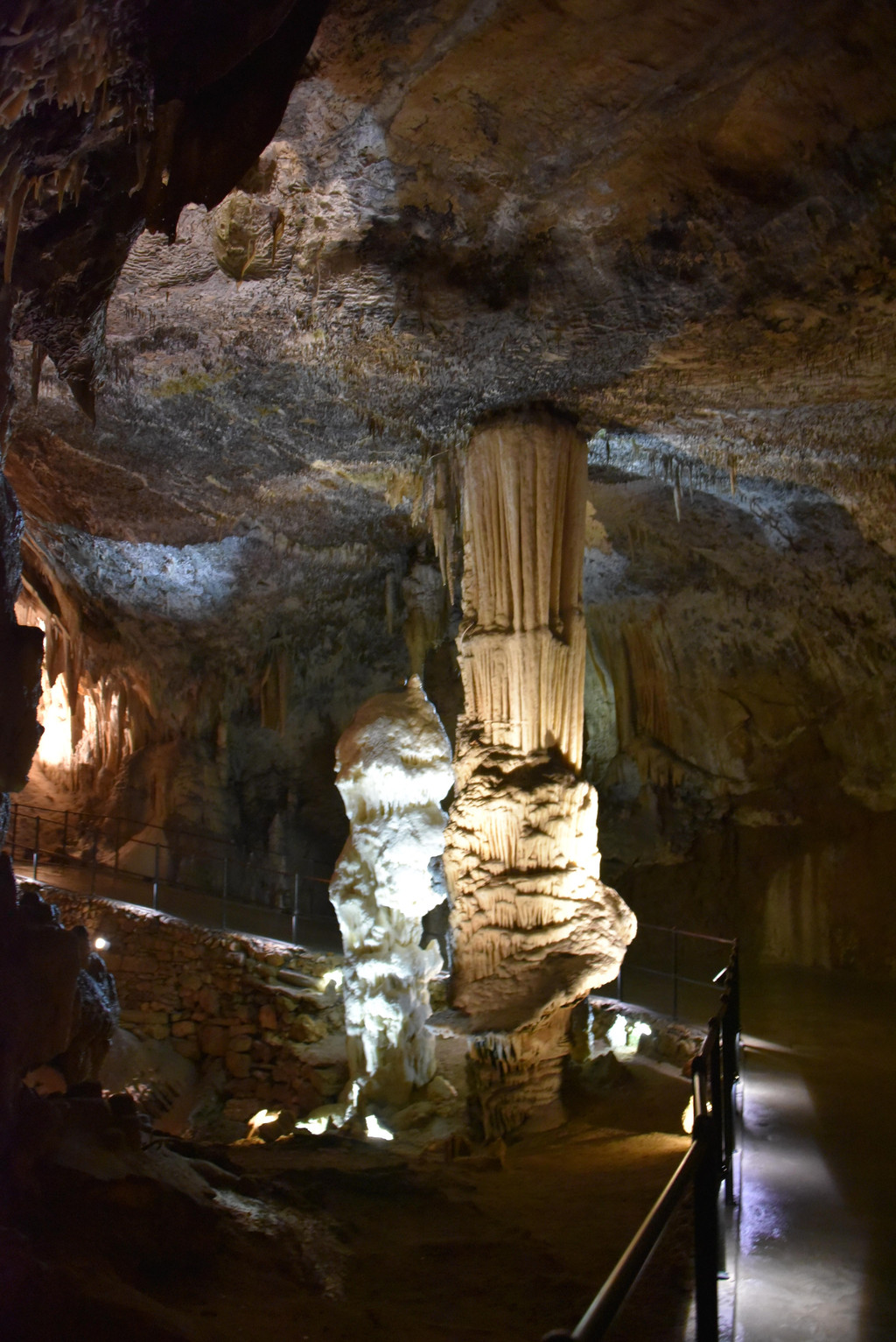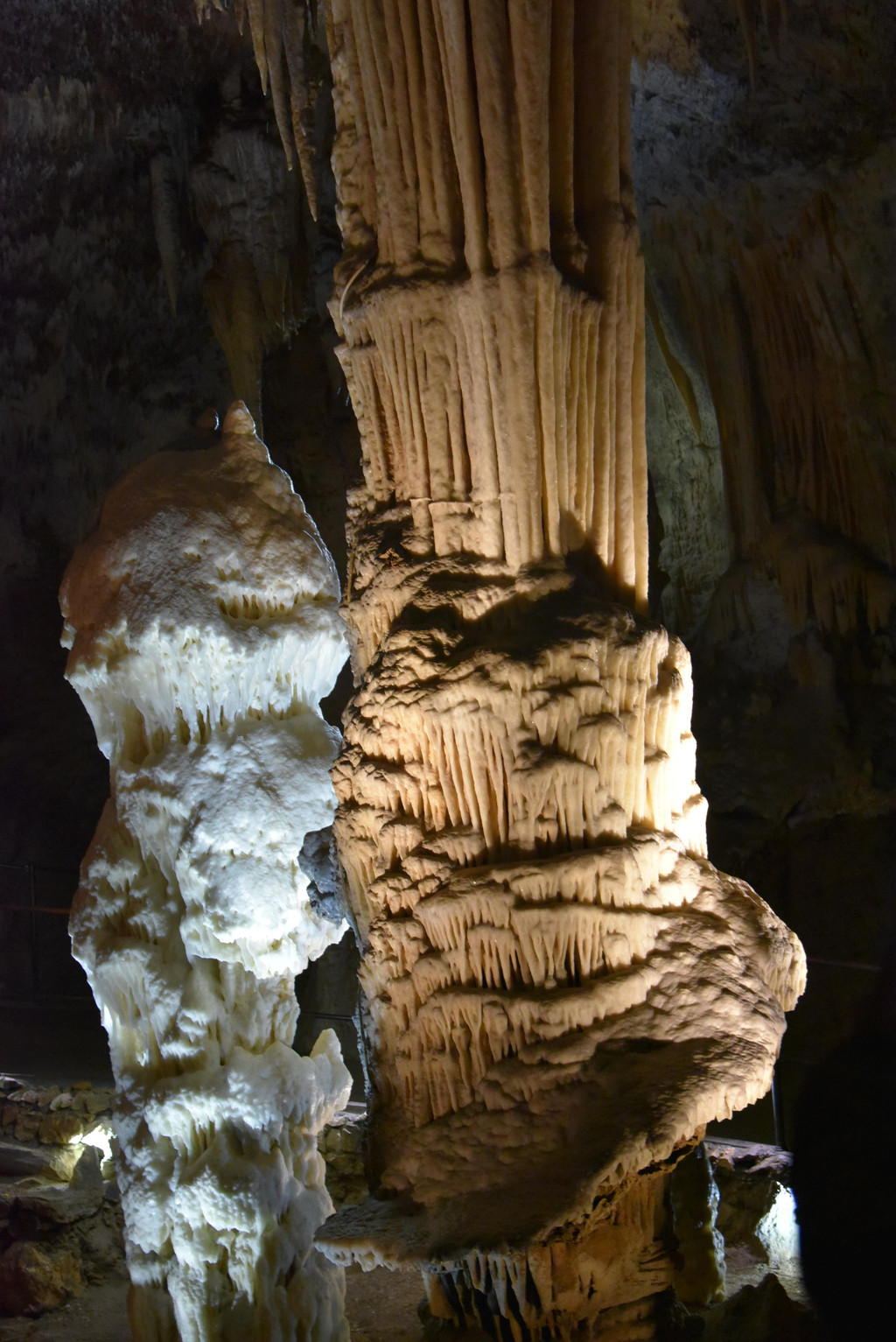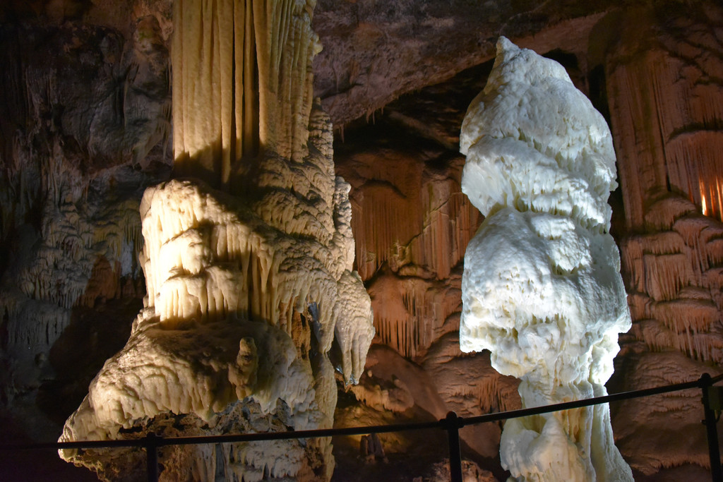 最最值得称赞的是接近尾声处的两个钟乳石,一黄一白,黄的顶天立地上面是石幔下面是石笋结合得天衣无缝,白的那个简直就像蛋卷冰激凌,顶部两个球要化了的感觉,记得刚才的白厅和黄厅吧,这里的一白一黄这就是它们的最佳总结。