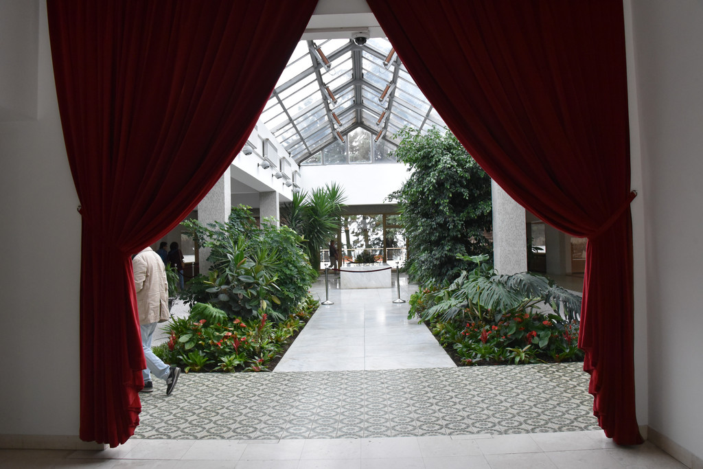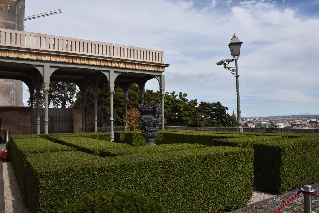 出了红色房间,室内观赏就算结束了,总的来说总统府这几间代表性的房间简单中透着奢华,现代与复古和谐相处。又是一段走廊,转身登上几级台阶就上到了上层平台,这是一个观景台,这里有一个小小的矮树造成的迷宫,
