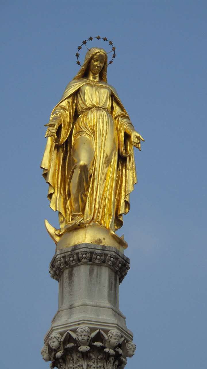柱子的顶部是一位天使,左手拿着权杖右手托着王冠(表示了君权神授),