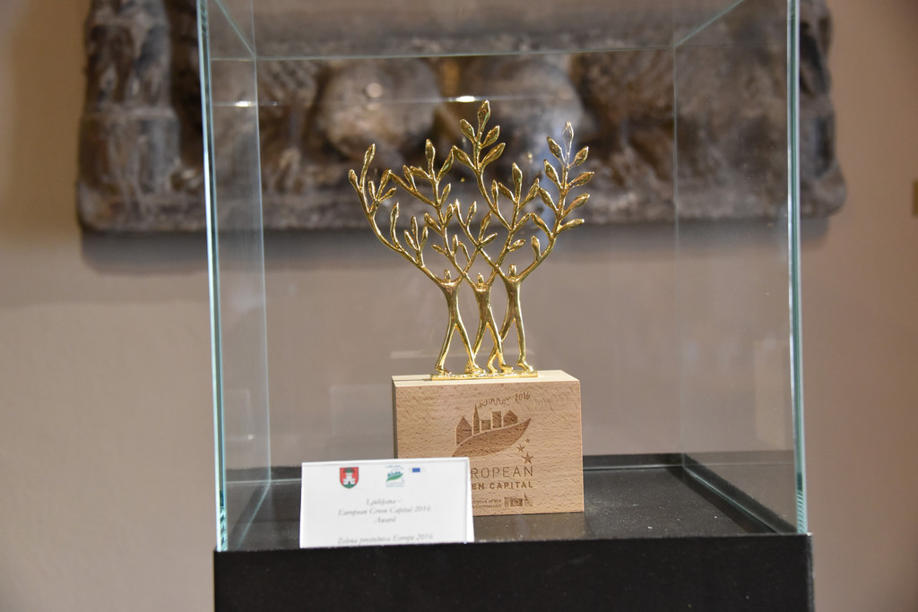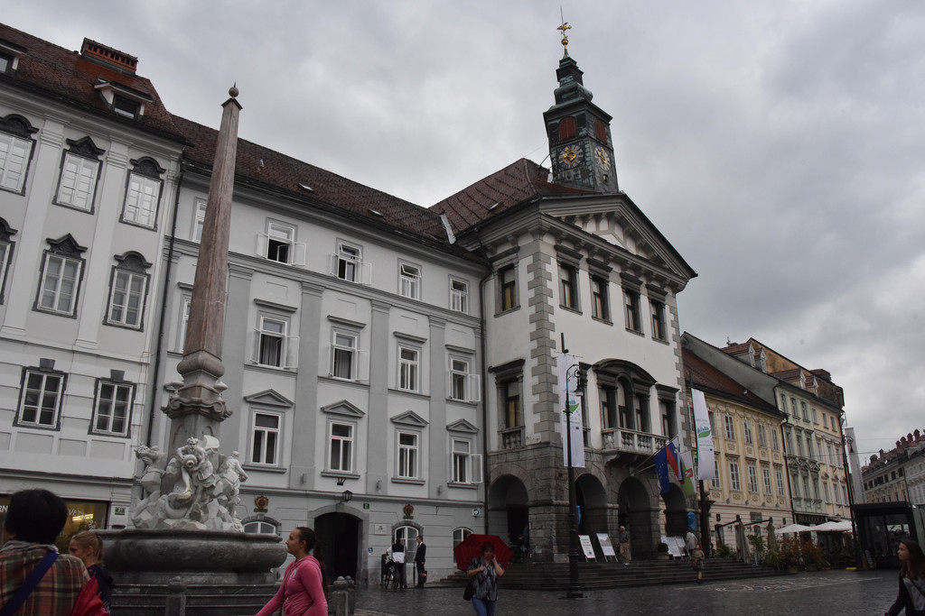 古堡下面的街道上有原来的市政厅, 17世纪兴建的文艺复兴式建筑,斯洛文尼亚独立后这里不再使用,在它前面的城市广场上有一个方尖碑,下面围绕着一组雕像,方尖碑来自埃及,代表了神的意志,下面三个人物各持一个陶罐向外流着泉水,代表了斯洛文尼亚的三条河流 萨瓦河,塔尔克河和卢布尔雅那河。