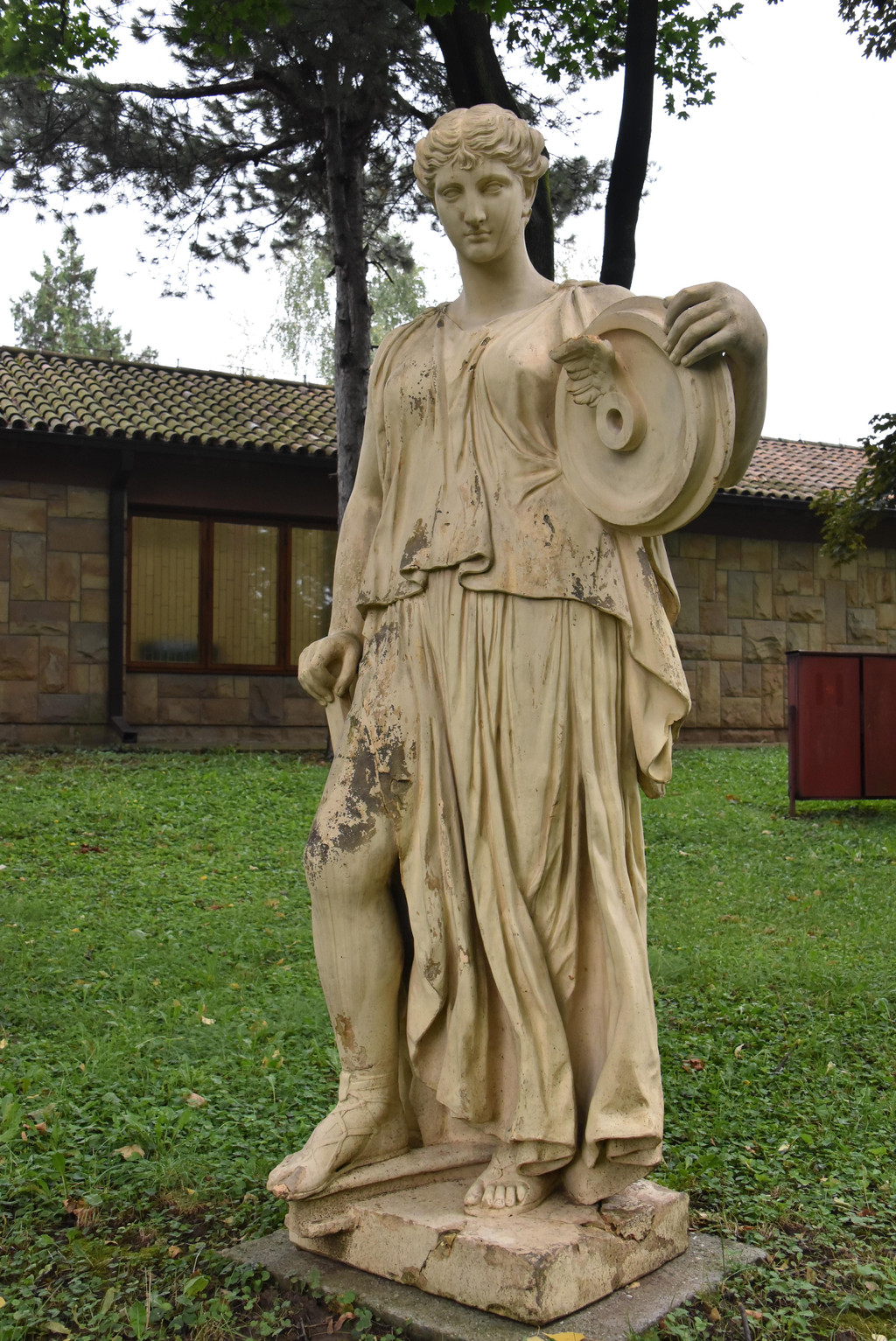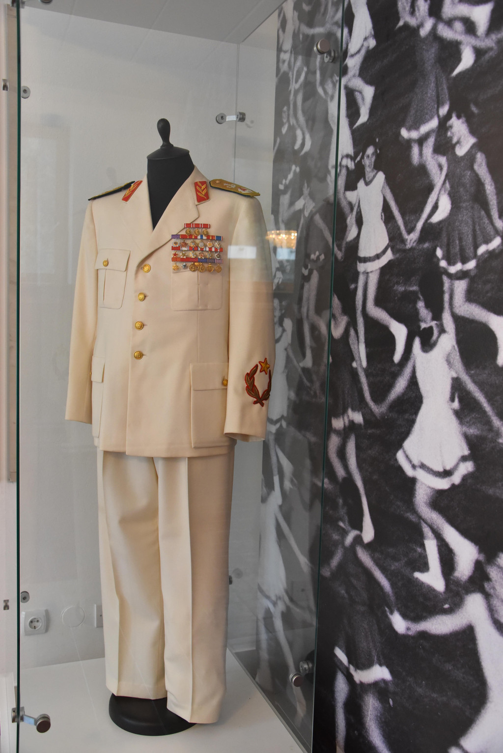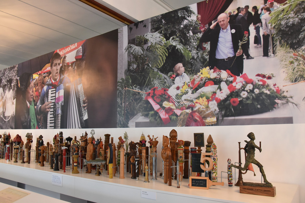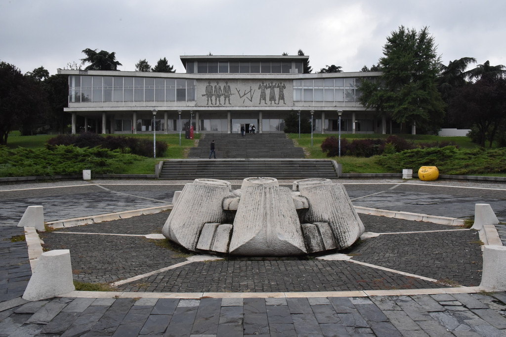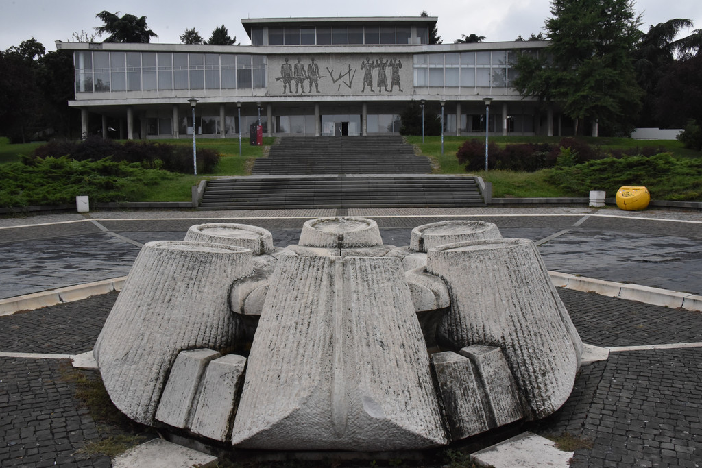 拾阶而上进入博物馆,这里在循环放映着一部铁托生前的新闻剪辑,有很多珍贵的历史镜头,有社会主义建设时期劳动场面,工农业生产,铁托与人民在一起,铁托在多个国家获得勋章获赠礼品,出访世界各国包括中国的长城,会见东西方各国领导人等等,让我们这些走过那个时代的人感到很熟悉。出展厅向后走,一路缓坡,两旁绿地上有很多雕像,有古典有现代,都是人们送给铁托的礼物,
