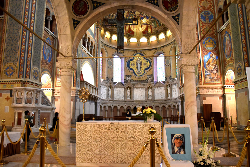 教堂中间的祭区桌旁摆放着特蕾莎修女的照片,旁边还摆放着鲜花,一定是刚刚做完活动,特蕾莎修女是世界著名的天主教慈善工作者,一生为印度加尔各答的贫困者服务,1979年获得诺贝尔和平奖。上网查看,2016年9月4日罗马教廷在她逝世19周年那天为她举行了封圣仪式,封她为罗马天主教廷的圣人,今天是9月5日,想必昨天这里的活动是与罗马同步举行的。