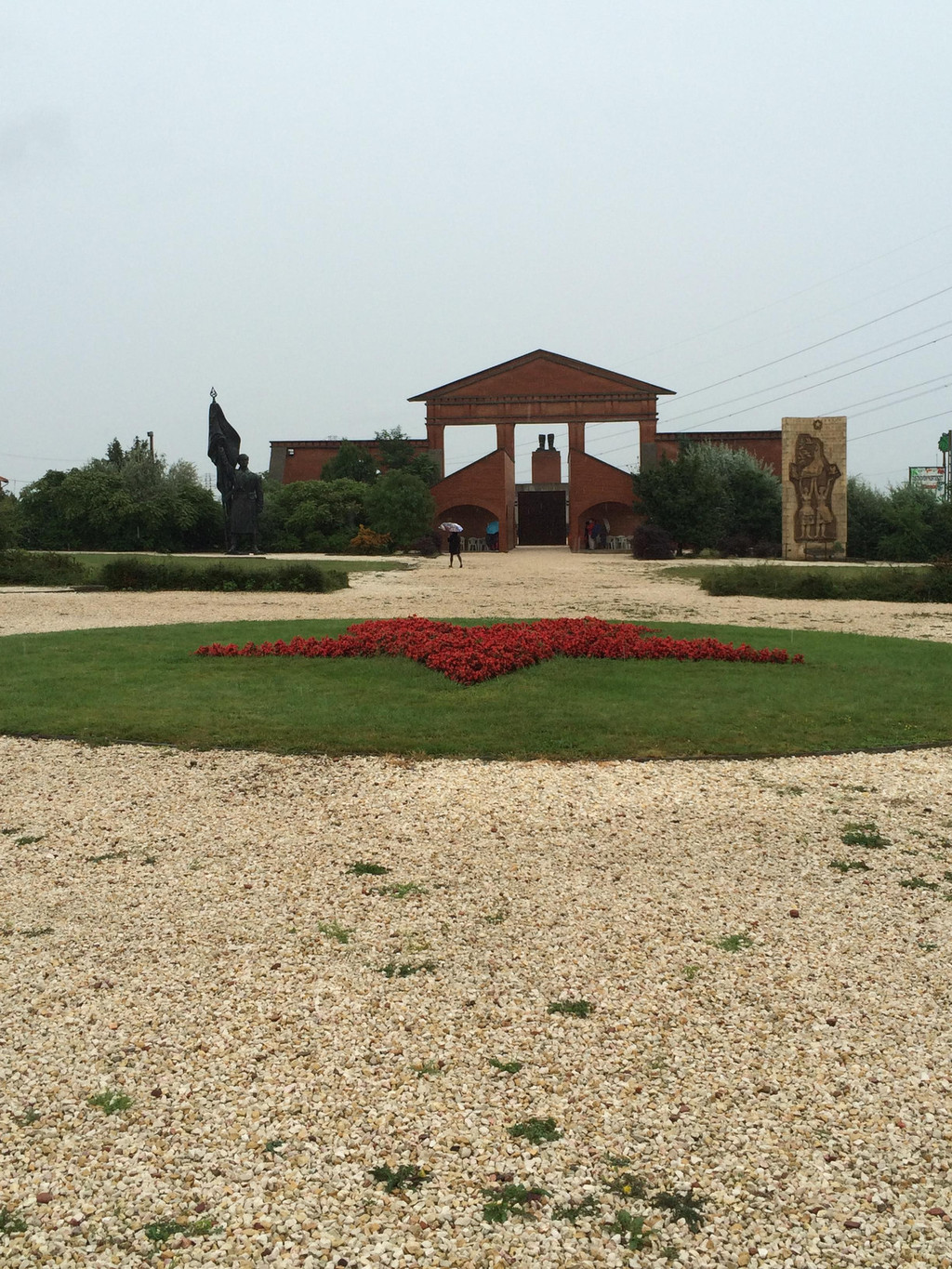 进入园区,碎石铺地,面积不大,但因为所有雕像都分布在最外圈,中心是一个圆形的由绿色青草包围的红色五角星的花坛,给人的视觉感受还是非常空旷,