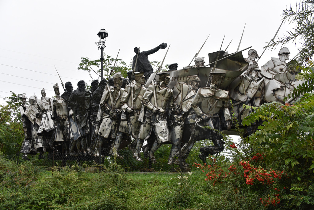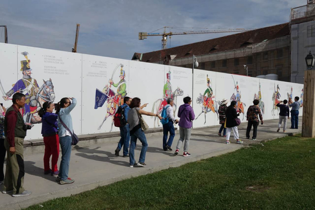 沿着街道走下去,左手有一系列的墙板上面是匈牙利各个时期的军服展示,匈牙利早期、奥斯曼时期,哈布斯堡统治时期以及一战二战期间的军服、战马、弯刀、长枪,匈牙利是一个骁勇善战的民族。展板一直延伸到一个空场,