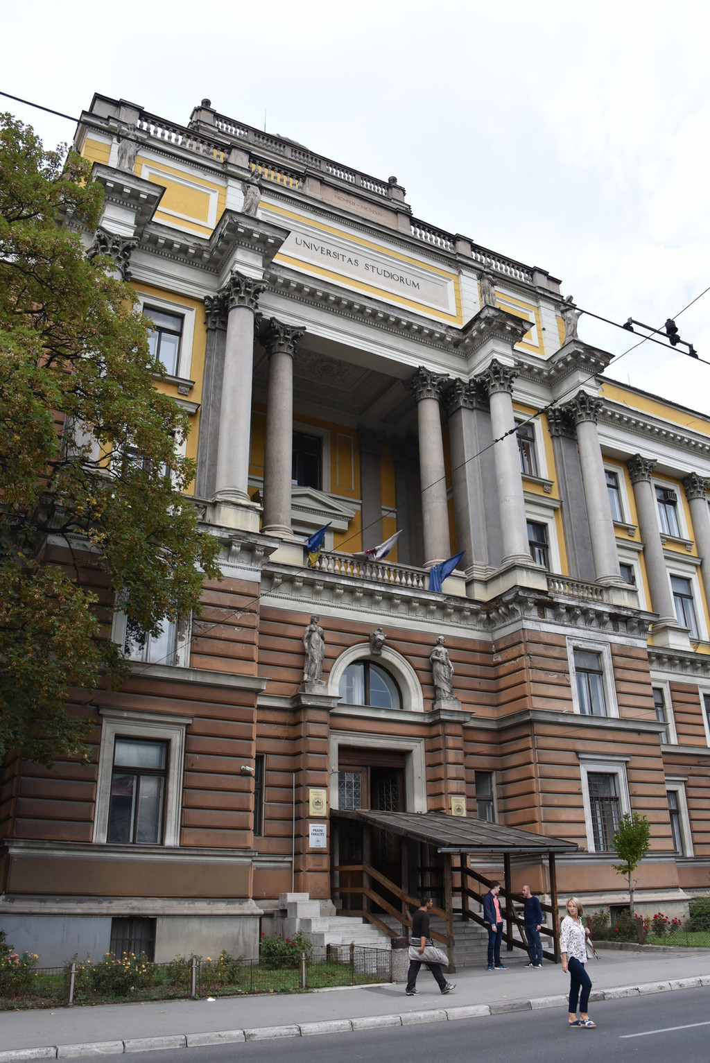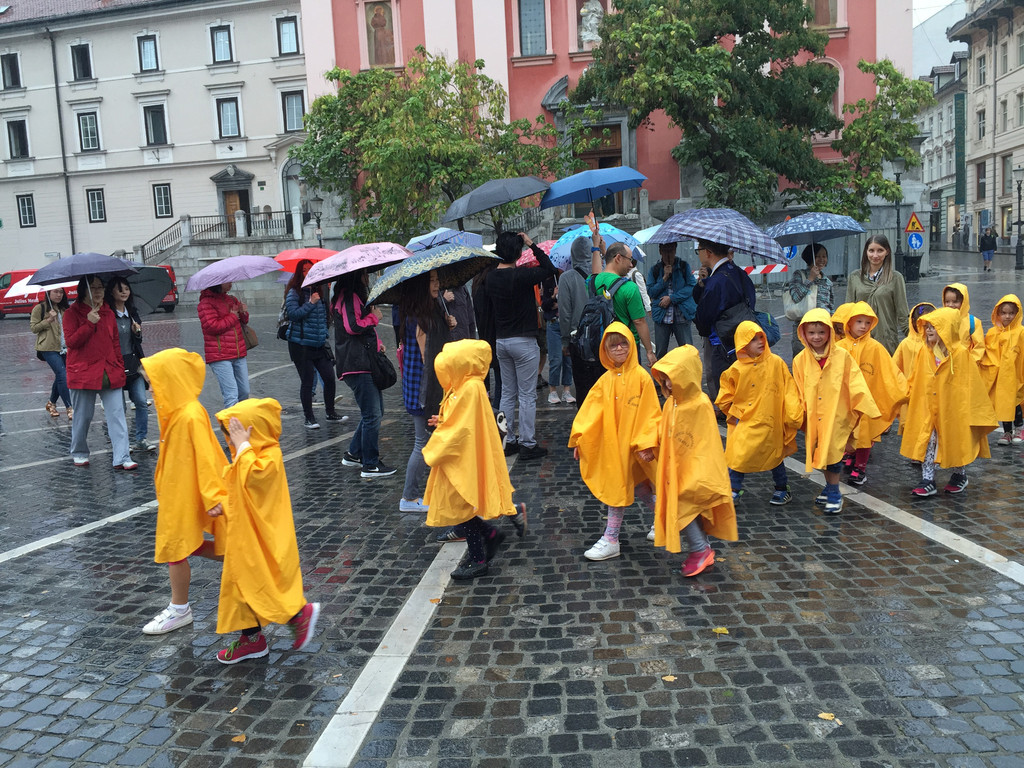 卢布尔雅那大学,白色的房子,前面的广场刚刚举办过活动,因为下雨,一些小学生穿着统一的雨衣走在路上色彩非常靓丽,