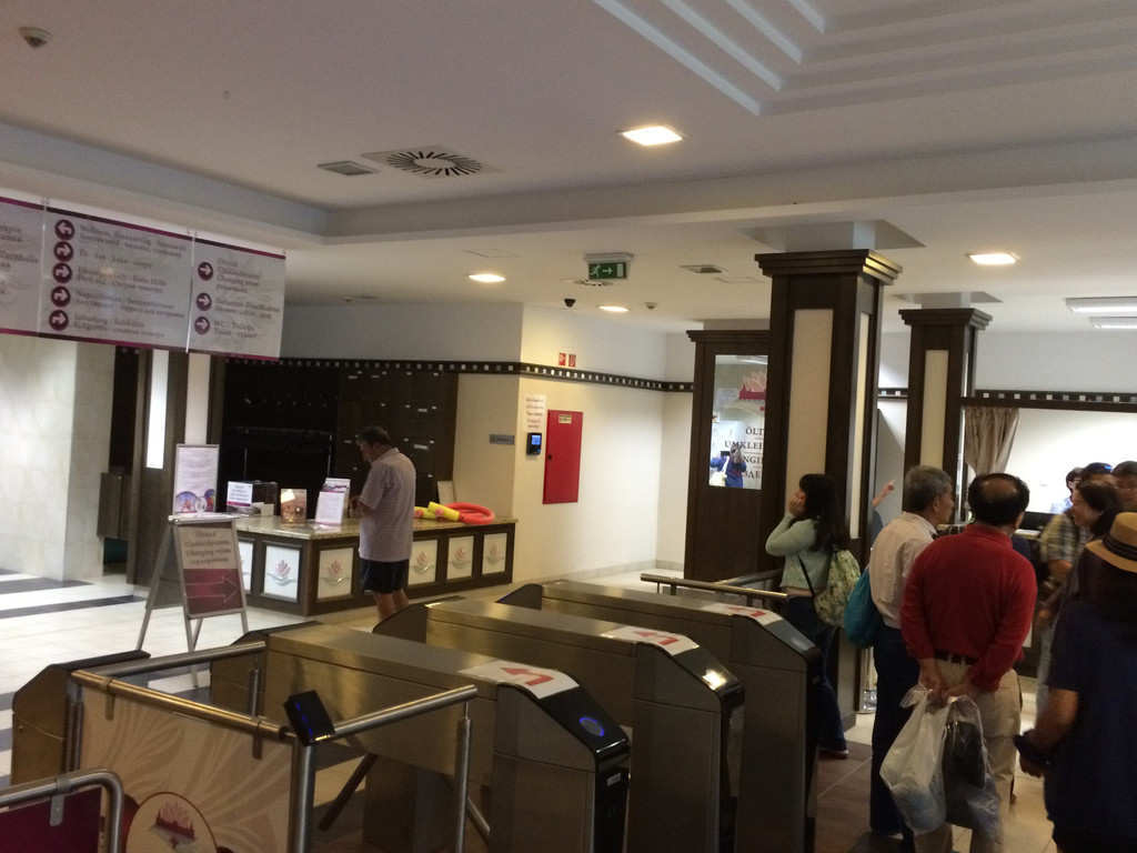 泡温泉的流程是,刷卡缴费,租用游泳圈(必须滴!谁也不想在这么深的的地方冒险),匈牙利不能使用欧元(这在来这里的第一天就领教了)需要使用当地货币福林,温泉费用2600福林每人,刷卡人民币63.3元,租用游泳圈1800福林,折合人民币45元左右,