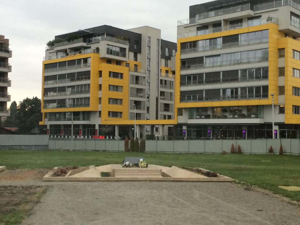 进入塞尔维亚,一路都是平原,道路两旁大片玉米地,葡萄园。中午就餐地点是贝尔格莱德市的中餐馆香格里拉饭店,直到车快停下郑导才提示大家,车的右手就是中国驻前南斯拉夫使馆在1999年被北约导弹击中的遗址。这正是在我们期待拜访的计划中的一项。1999年的5月7日(北京时间5月8日),北约的美国轰炸机发射三枚精确制导炸弹击中了中华人民共和国驻南斯拉夫联盟大使馆,当场炸死三名中国记者邵云环、许杏虎和朱颖,事情的原因引起了国人的猜测,真相在十几年后被不正式地公开,因为南联盟击落了一架美国最先进的隐形飞机F-117,将其残骸交给了中国,暂时放在使馆的地下室,用以研究当时最先进的隐形技术,没想到的是该残骸所带的自毁装置虽然没起作用,但其定位报警装置却还在正常工作,持续发出的报警信号引来了北约的美国轰炸机,所幸炸弹并没有将残骸全部毁掉,有消息透露我国的飞机隐形材料研制的进度因此提高了十年不止,这也是血的代价换来的。这是一片被金属板围挡的区域,从围挡的空隙看进去是一片平地,过去的建筑已经荡然无存,平地中间有一个平台,上面有一个黑色大理石碑。