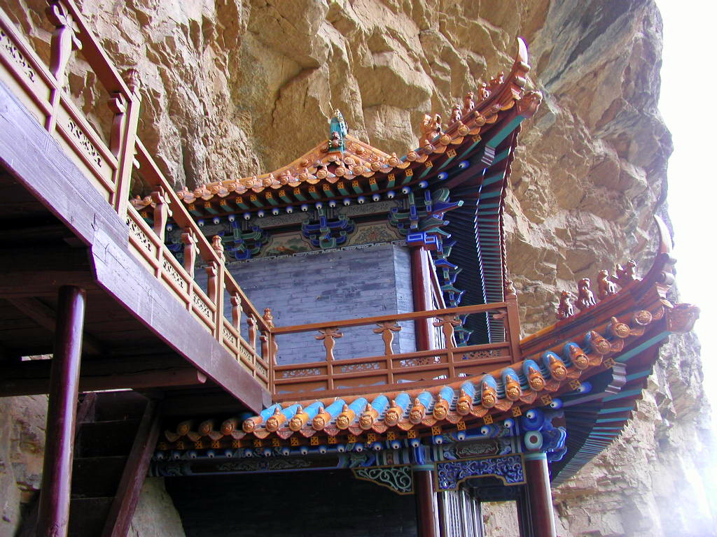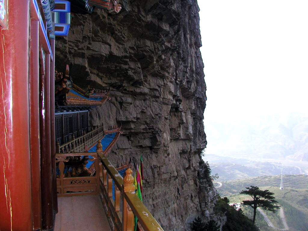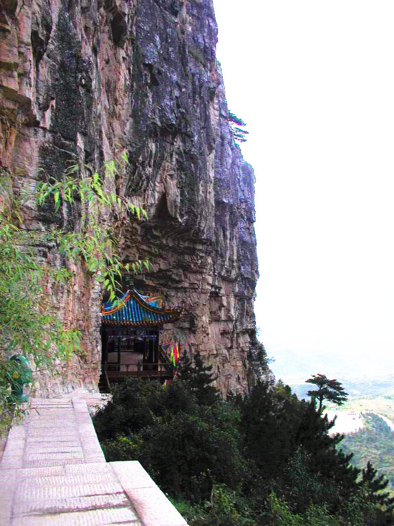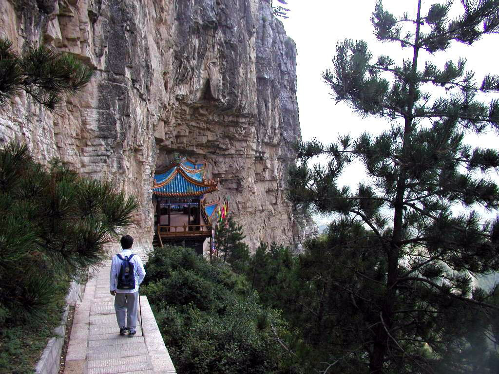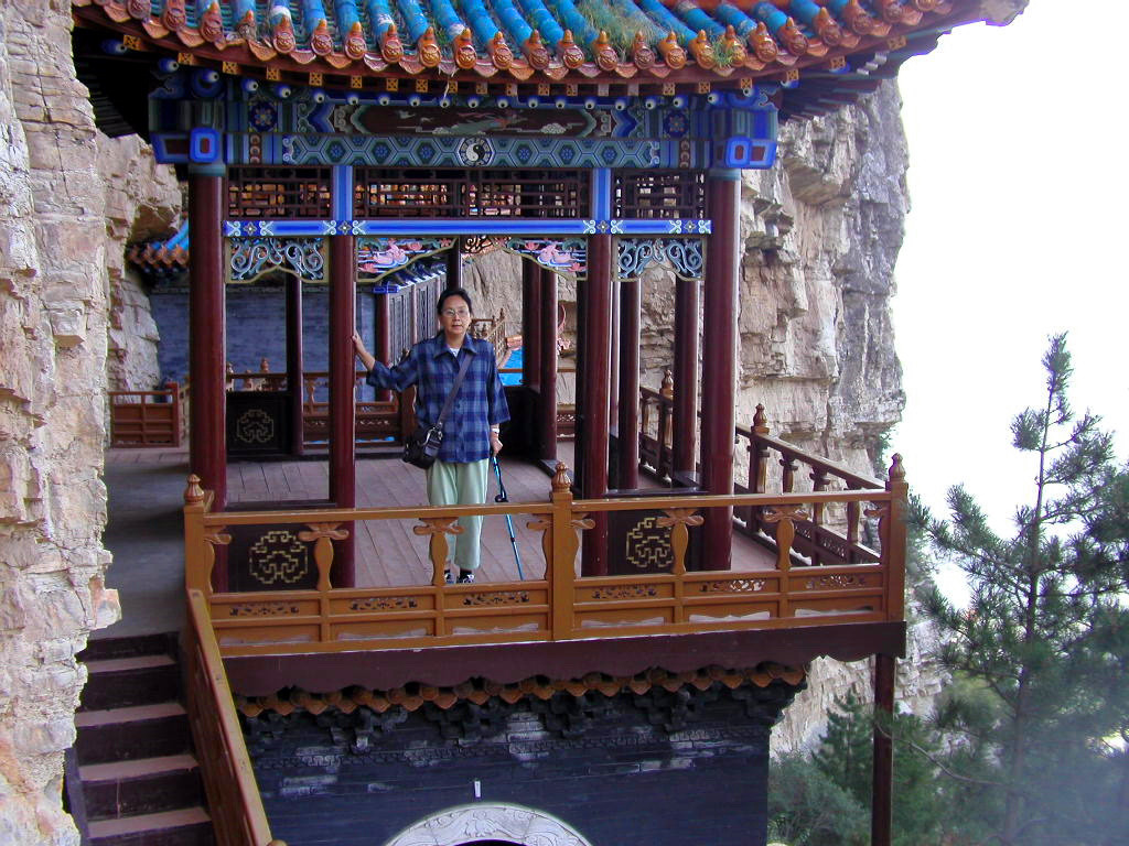 原路返回,再向上攀登,就来到北岳恒山的主庙“恒宗大殿”,它建在恒宗峰南半山腰的峭壁间,背崖临谷,雄视南天,很是壮观。进山门,正中有陡阶103级,而且级级向前倾斜40度,上的时候真有点腿抖。据说这103台阶,包含着道教的玄机,道教认为“天地奇数偶数相加刚好100,再加上道教的三清刚好103”,以前对道教一无所知,这次才对道教有个大概了解。