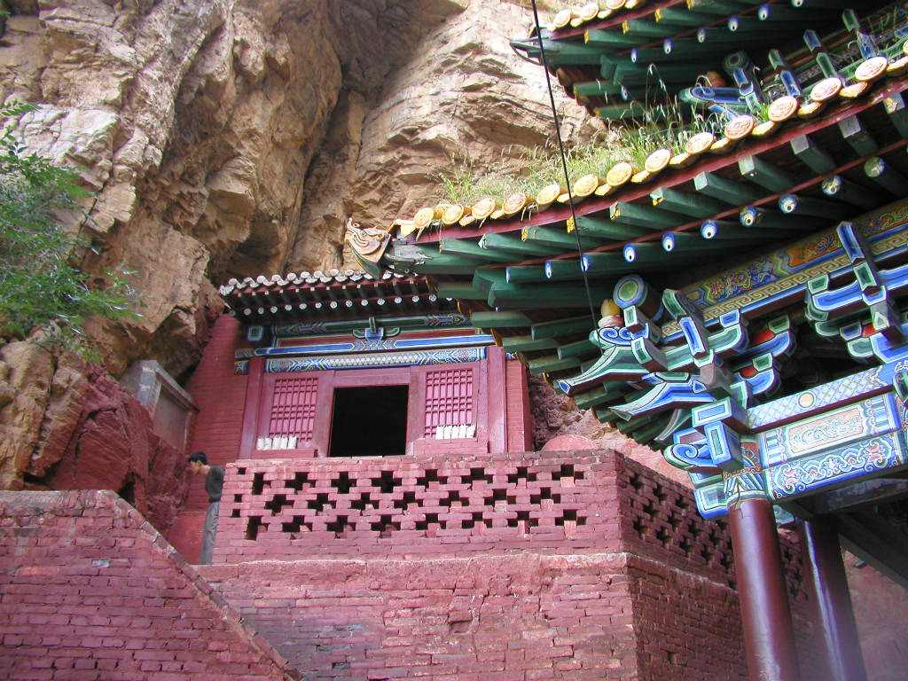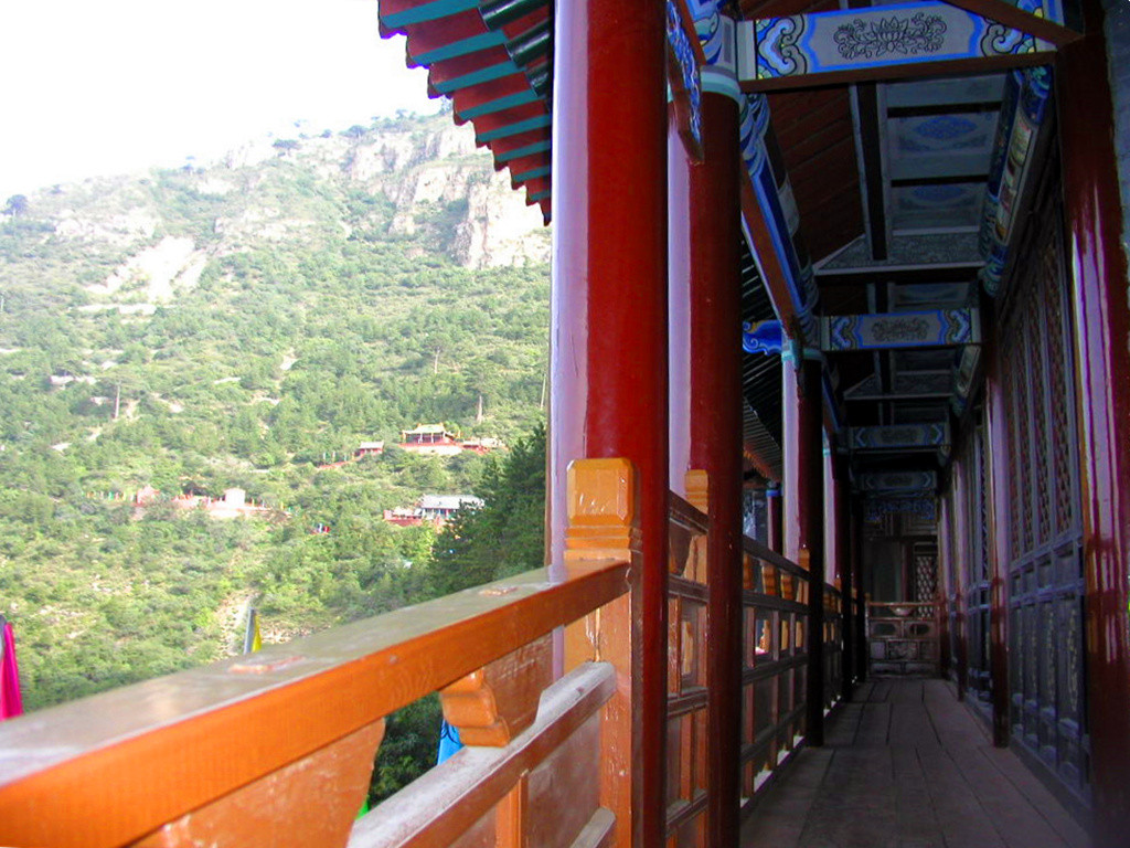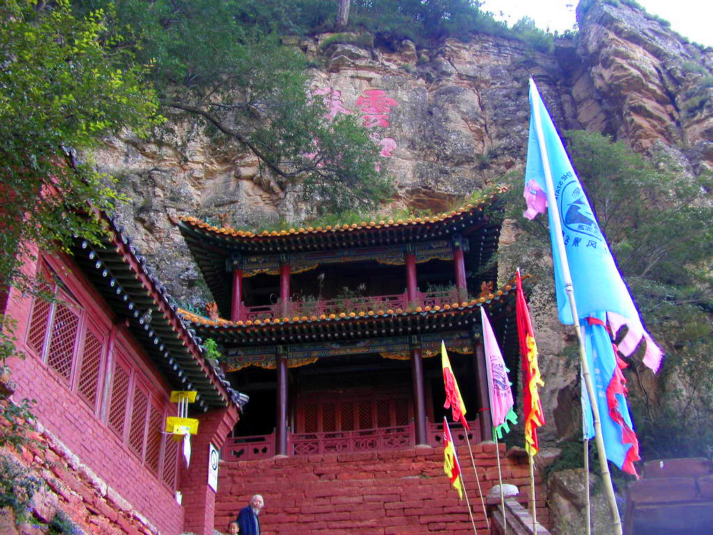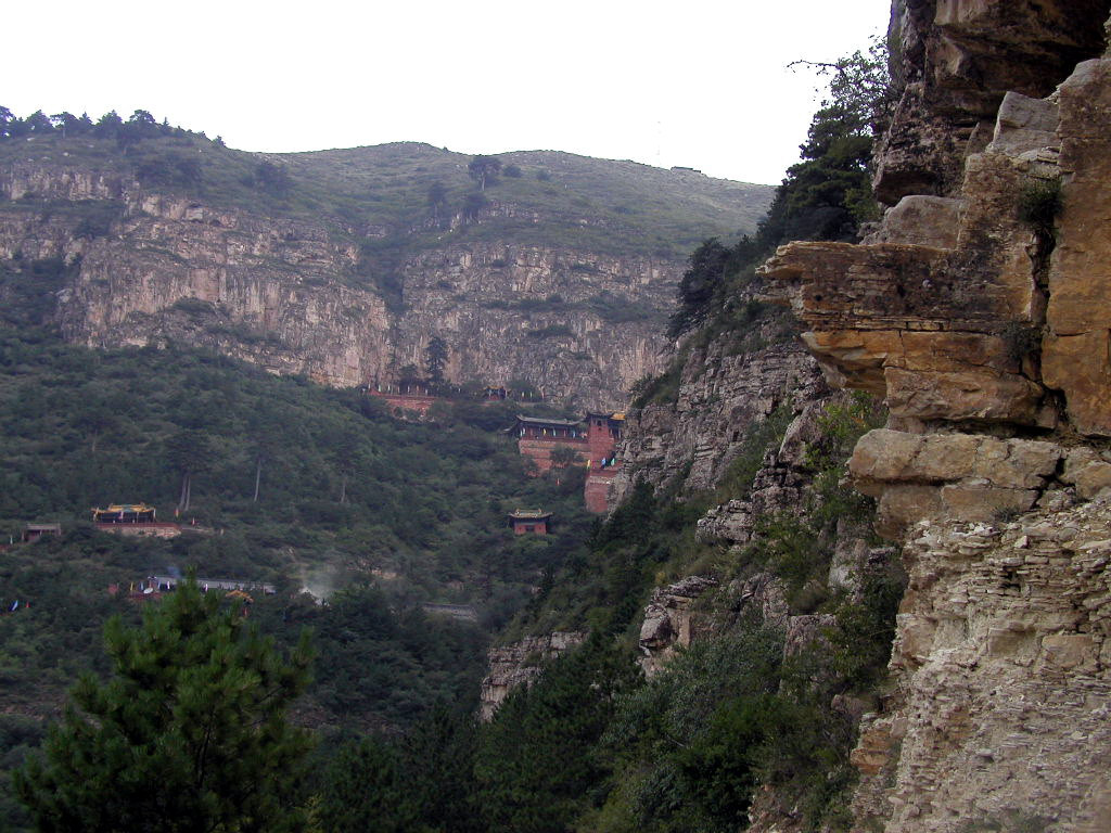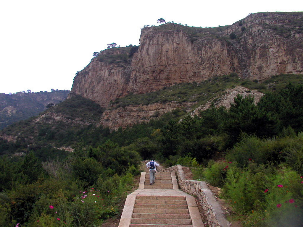 原路返回,再向上攀登,就来到北岳恒山的主庙“恒宗大殿”,它建在恒宗峰南半山腰的峭壁间,背崖临谷,雄视南天,很是壮观。进山门,正中有陡阶103级,而且级级向前倾斜40度,上的时候真有点腿抖。据说这103台阶,包含着道教的玄机,道教认为“天地奇数偶数相加刚好100,再加上道教的三清刚好103”,以前对道教一无所知,这次才对道教有个大概了解。