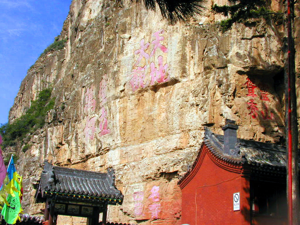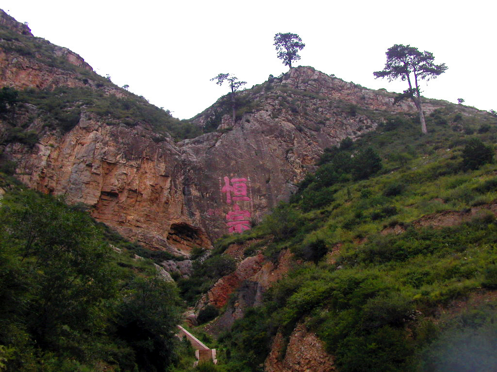 顺着山向上不远,在松柏掩映的峭壁高处,刻着十分醒目的“恒宗”两个大字,是明代山西督学张升的手笔,字体雄浑刚劲,是恒山数以千计的石刻铭文中最具特色的。这两个字高13米,宽6米,因字体巨大,这里被称为“大字湾”。