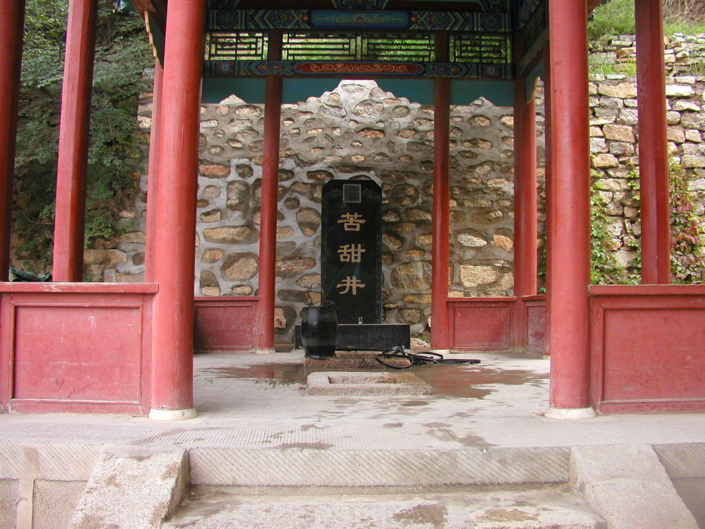 首先进入的方形院落,有一白云堂,因古代用来接待前来祭祀、游览的达官显贵,故称接官亭。从这里往东,就看到一个玄井亭,里边有两井并列,相隔不到1米,亭内有个碑,上写“苦甜井”三字,据说北边的井甜如甘露,系高品质的矿泉水,且水及井台不到2米,清澈见底。南边的井却苦涩无比,相隔不到一米,却有如此的水质差别,不知到底是什么缘故。后来因苦井常被人往里填土,而不再有水。可甜水却用之不竭,从未干涸过。我们到时正赶上小道士来取水,我也用杯子取一点尝尝,虽无甘甜,到也爽口。