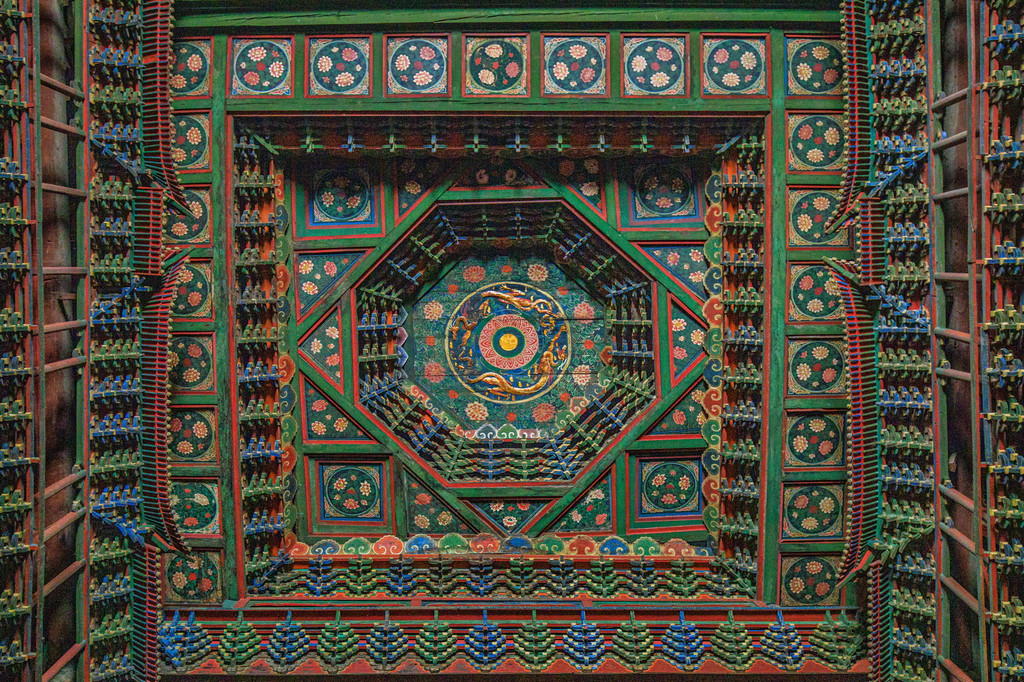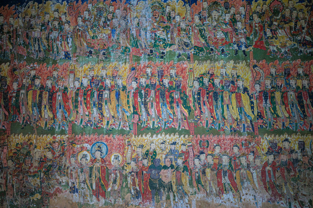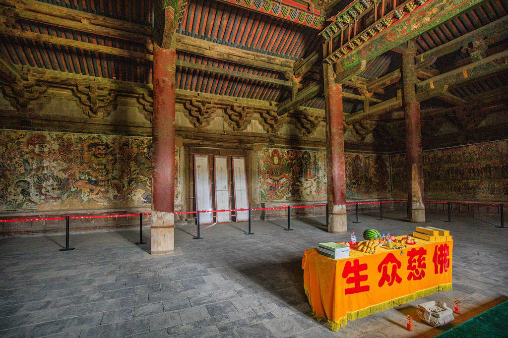 进了殿内,明间梁架间有木雕天宫楼阁和天花藻井,为元代遗构,在山西省内尚属罕见。大殿内四壁的巨幅工笔彩画,高3米,长56.8 米,882个人物,表情生动自然,儒、释、道三教合一,是元代壁画中的精品。
