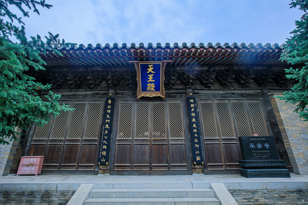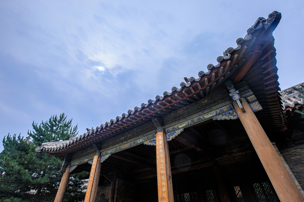 檐下明间、次间均安装有隔扇门,後壁开板门,下面左右两端有【庄、严】两个大字,后墙上板门两侧有【虎啸龙吟】四个大字。在建筑技艺和风格上,大殿充分体现了元代及北方古建筑的风格特色。