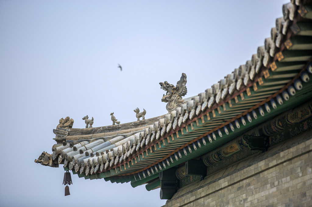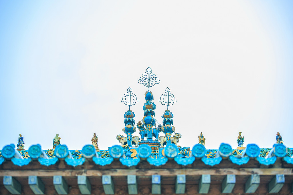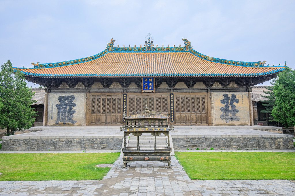 寺中并没有传统意义上的大雄宝殿,而眼前的传法正宗殿就等同于大雄宝殿了。令人诧异的是虽然大殿不属皇家寺院建筑,但是殿顶中部居然以黄色琉璃瓦覆盖,四边以蓝、绿琉璃瓦镶饰,堆花脊饰,脊上鸱吻两两相对,制作精美,造型生动。