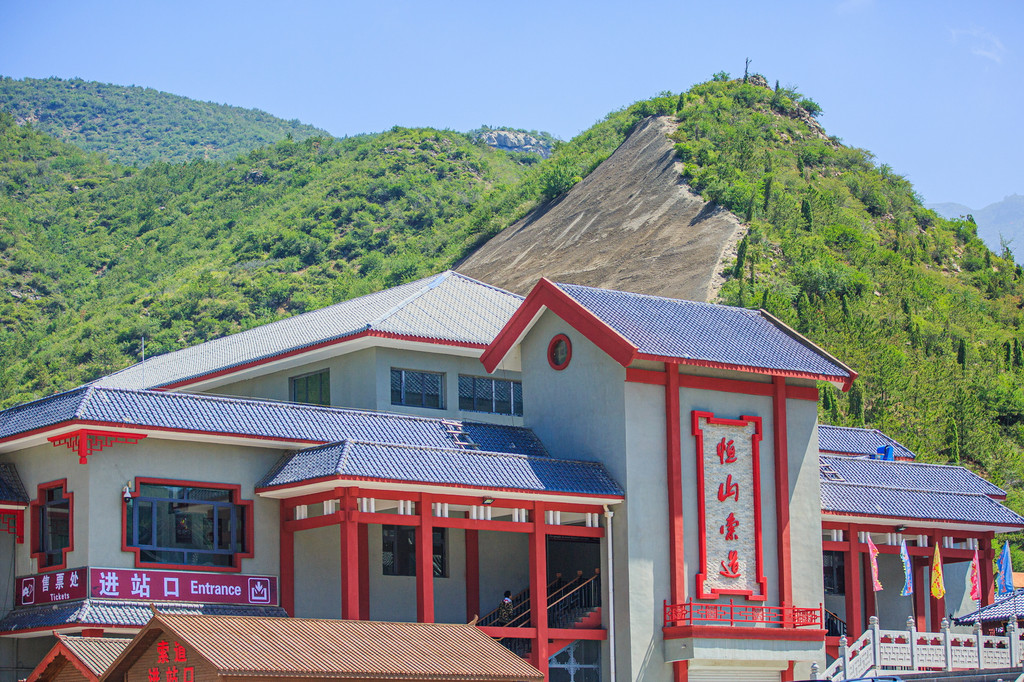 走出金龙口便是恒山山门。恒山山门高10米,宽16米,明清风格,为四柱七楼,三开门格式,混凝土浇注,纯白大理石围基,斗拱铺作,黄琉璃瓦覆顶,正面正中匾额“北岳恒山”为原新华社长、当代大手笔穆青题写,后面匾额“绝塞胜境”系当代书法名家夏桐郁所书,整个山门庄严雄浑。