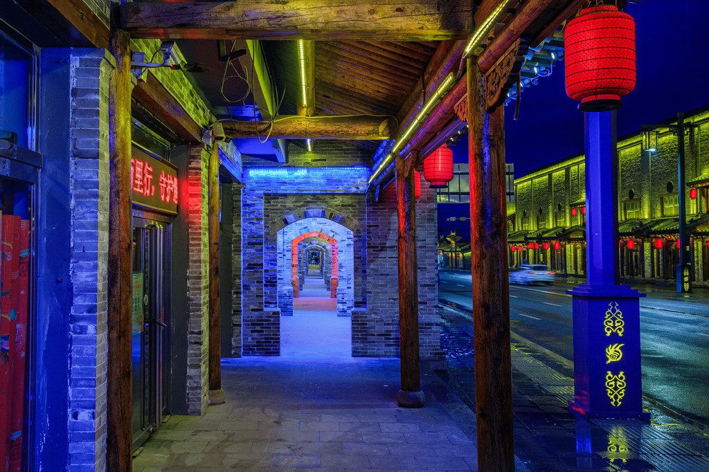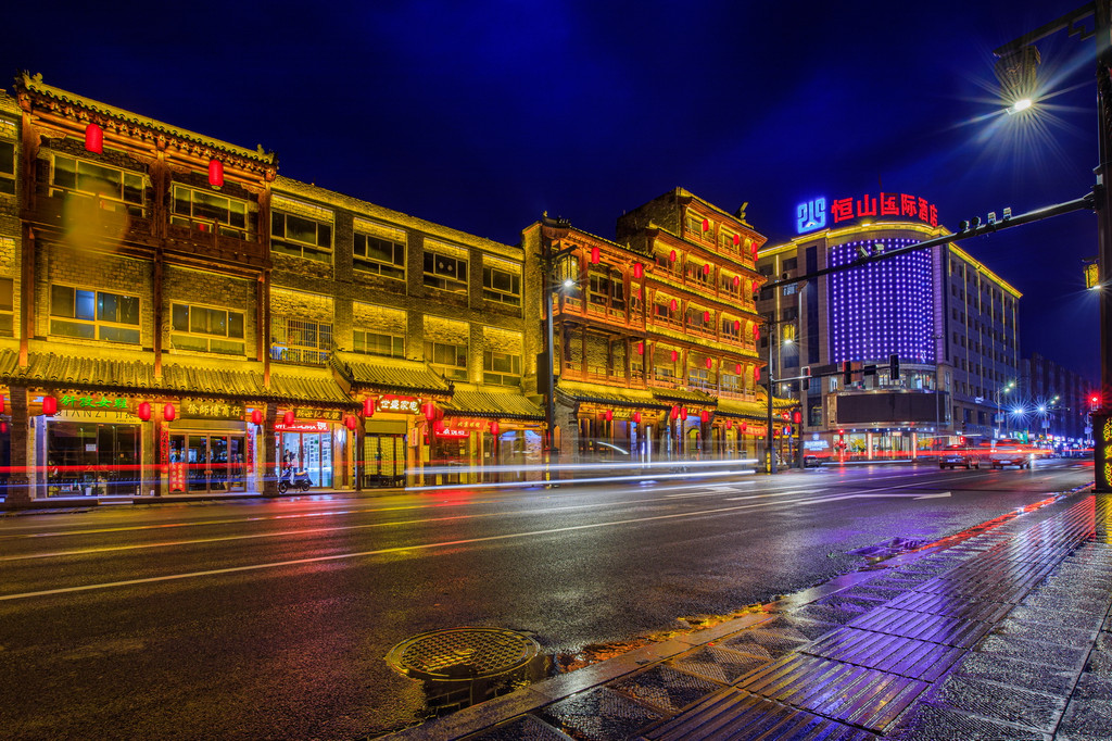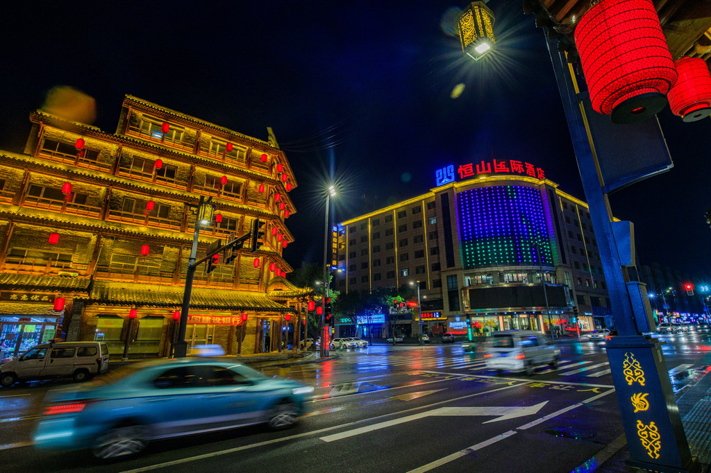 改建后的古城浑源,呈现出一派古色古香的风格。夜晚永安西街的沿街商铺,一改白天的色调,商铺门前的亭台穿廊,碧瓦飞甍;斗拱相连,古朴庄雅,在灯光的映射下更显古韵。