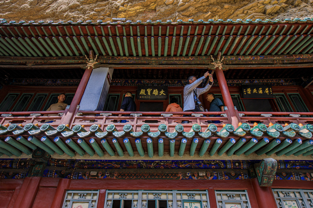 据导游介绍,首先在崖壁上打外小内大的孔,在孔里放一个木楔子,再把加工有楔口的横梁用力砸入,洞里的木楔子便会楔入横梁里,外面越用力,里边咬合的就越紧,寺庙的重量传递到岩壁,以这种半插崖壁的横梁为基础,借助岩石的托扶,与回廊栏杆、上下梁柱紧密链接,从而形成的木质框架式结构,建造成了 “悬空寺”