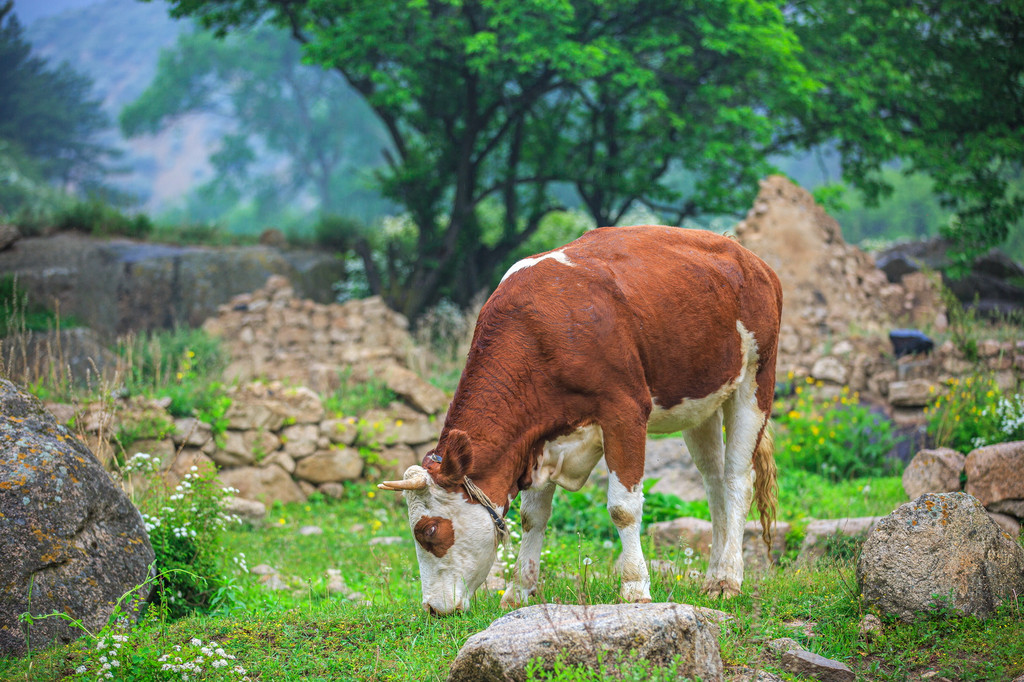 沿海藏寺西侧山梁攀爬而上,这里没有传统意义的山路,但是却也是一步一景,随处可见散养的黄牛与森林、植被相映成趣。